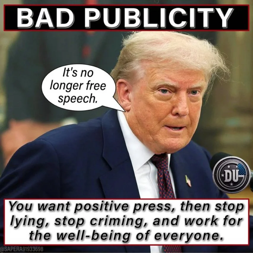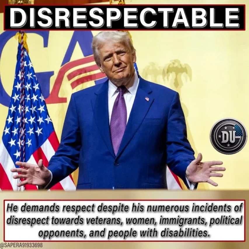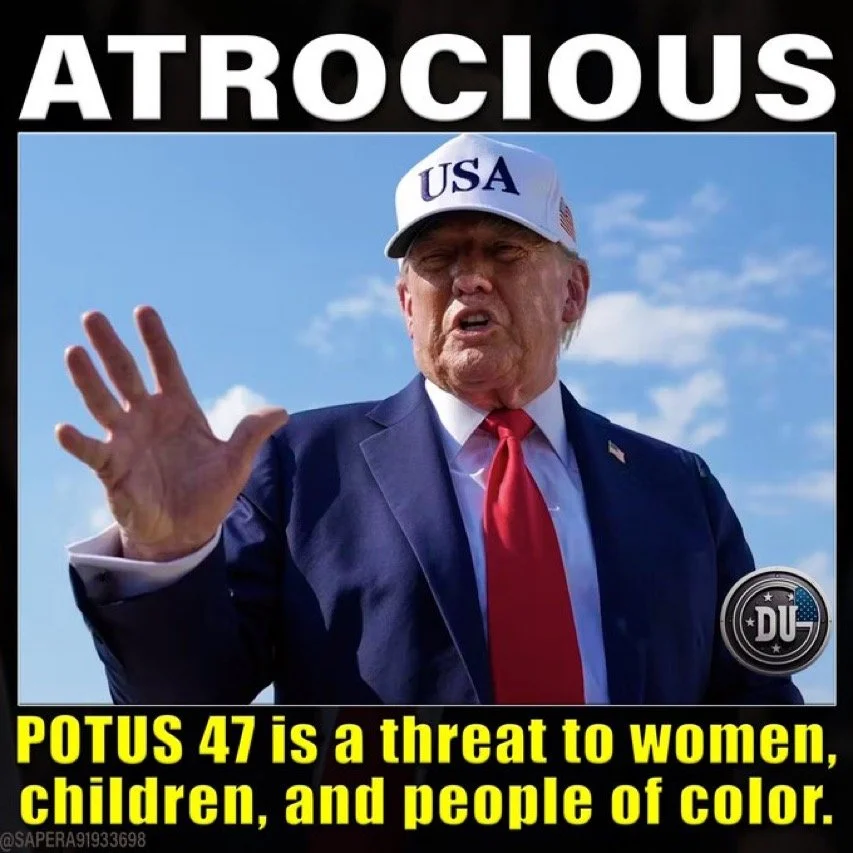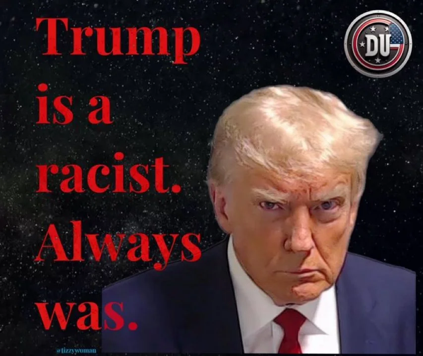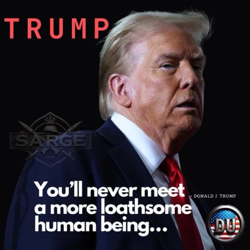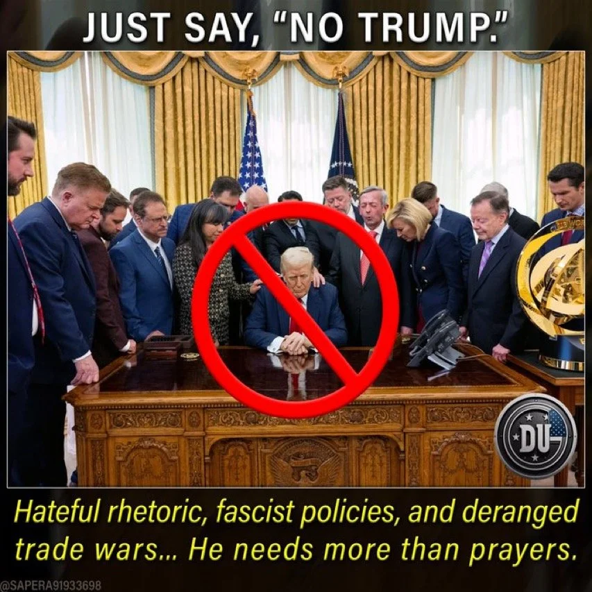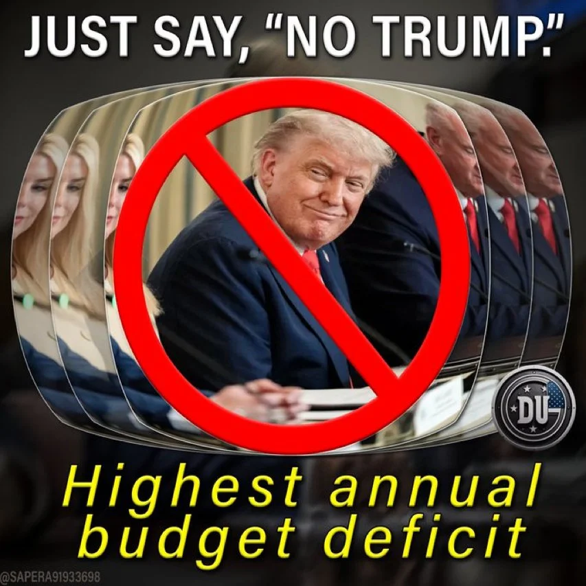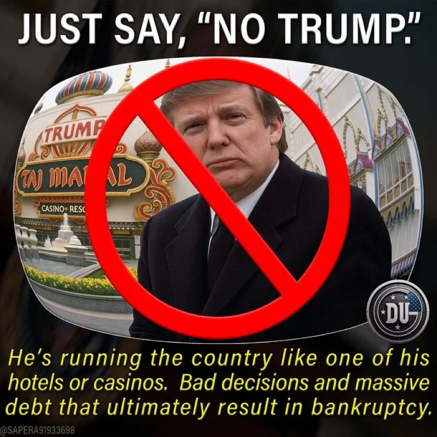 Image of Donald Trump with a red prohibition sign across his face. Text at the top says "Just say, 'No Trump'" and at the bottom says "Owes $93 million in sexual abuse judgements."