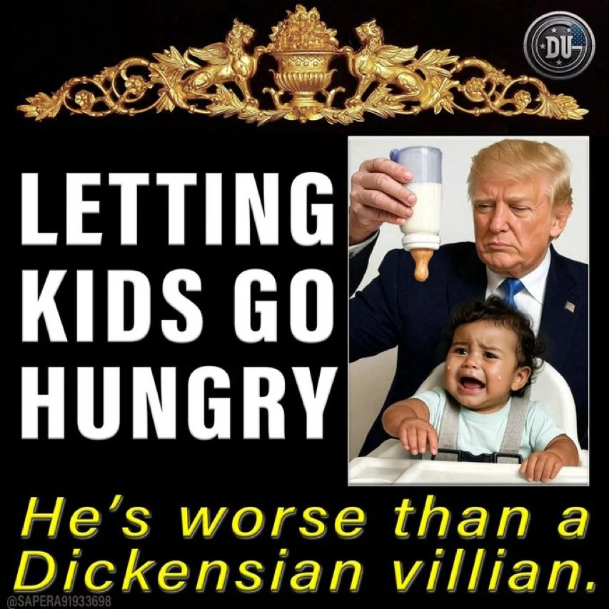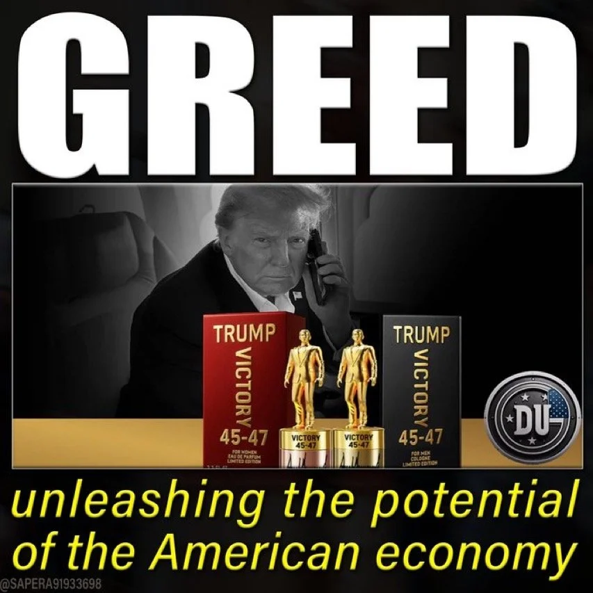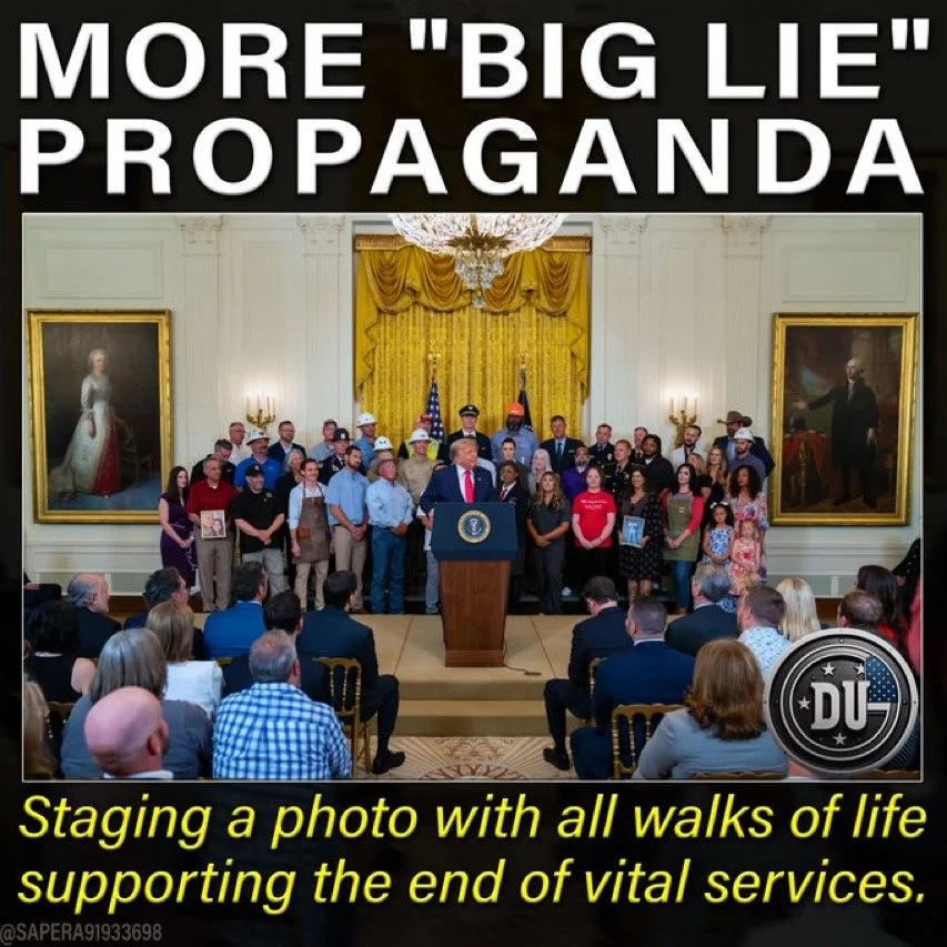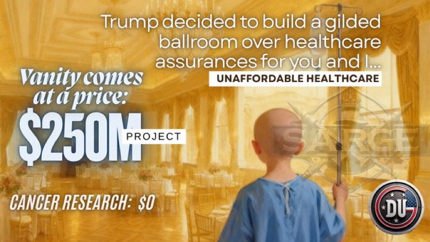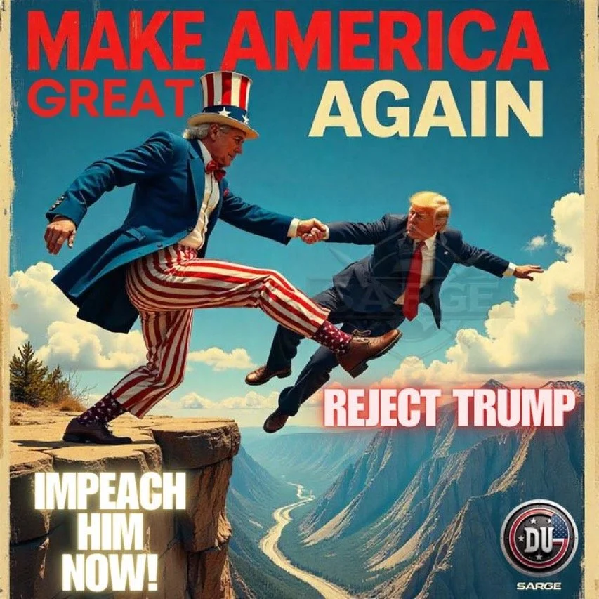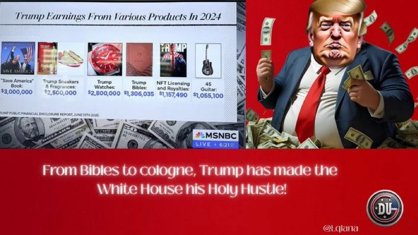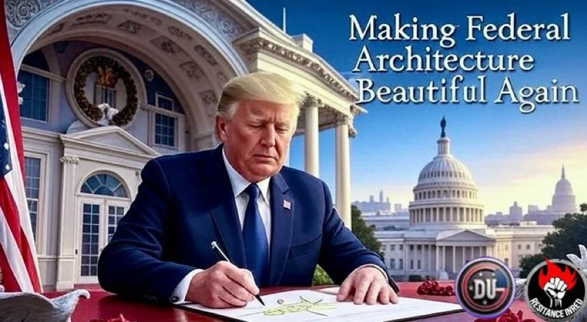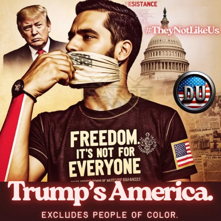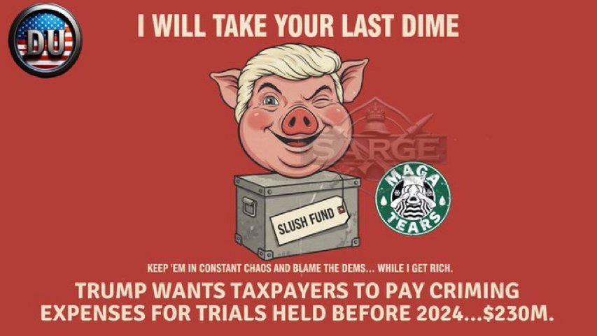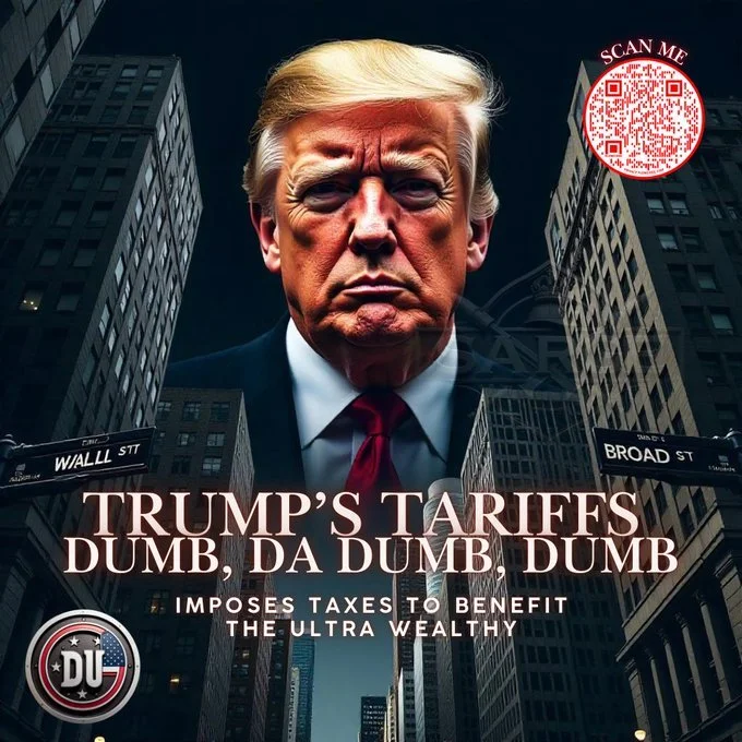 A photo of Donald Trump speaking at a podium with the text "POTUS 47 AGENDA" at the top. To the right, it lists four points: "NO ART, NO FOOD, NO HEALTH, NO SCIENCE" in yellow text. At the bottom, it says "BILLIONAIRES EXEMPT." There is a round seal or logo with the initials "DU" in the bottom right corner.