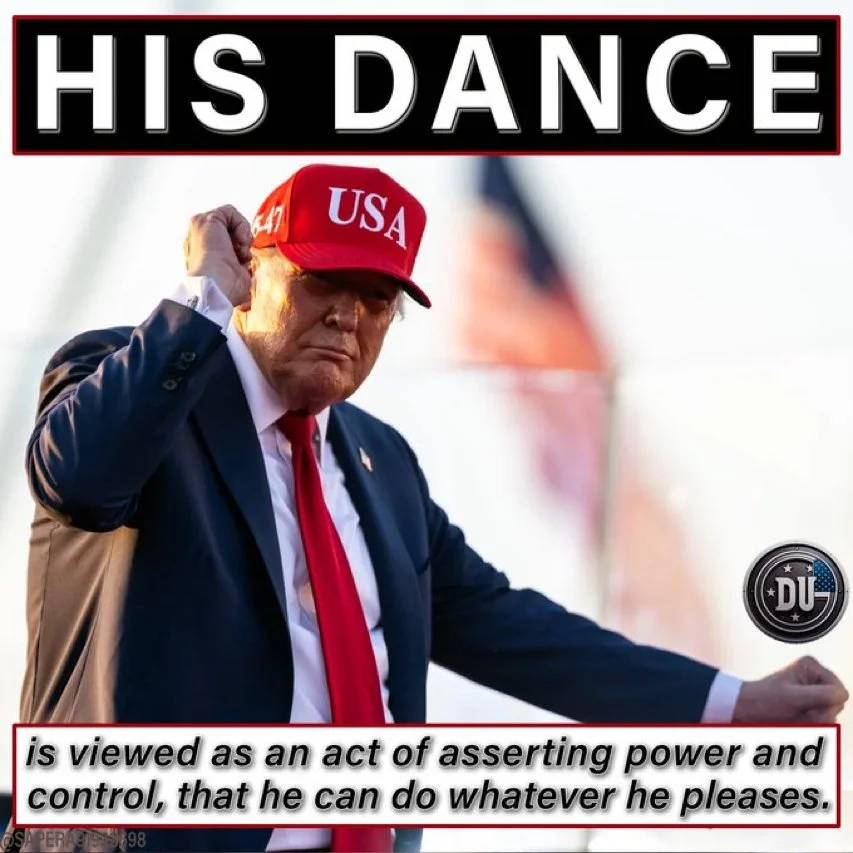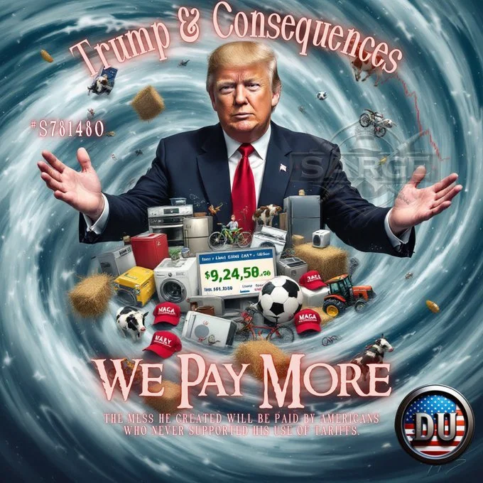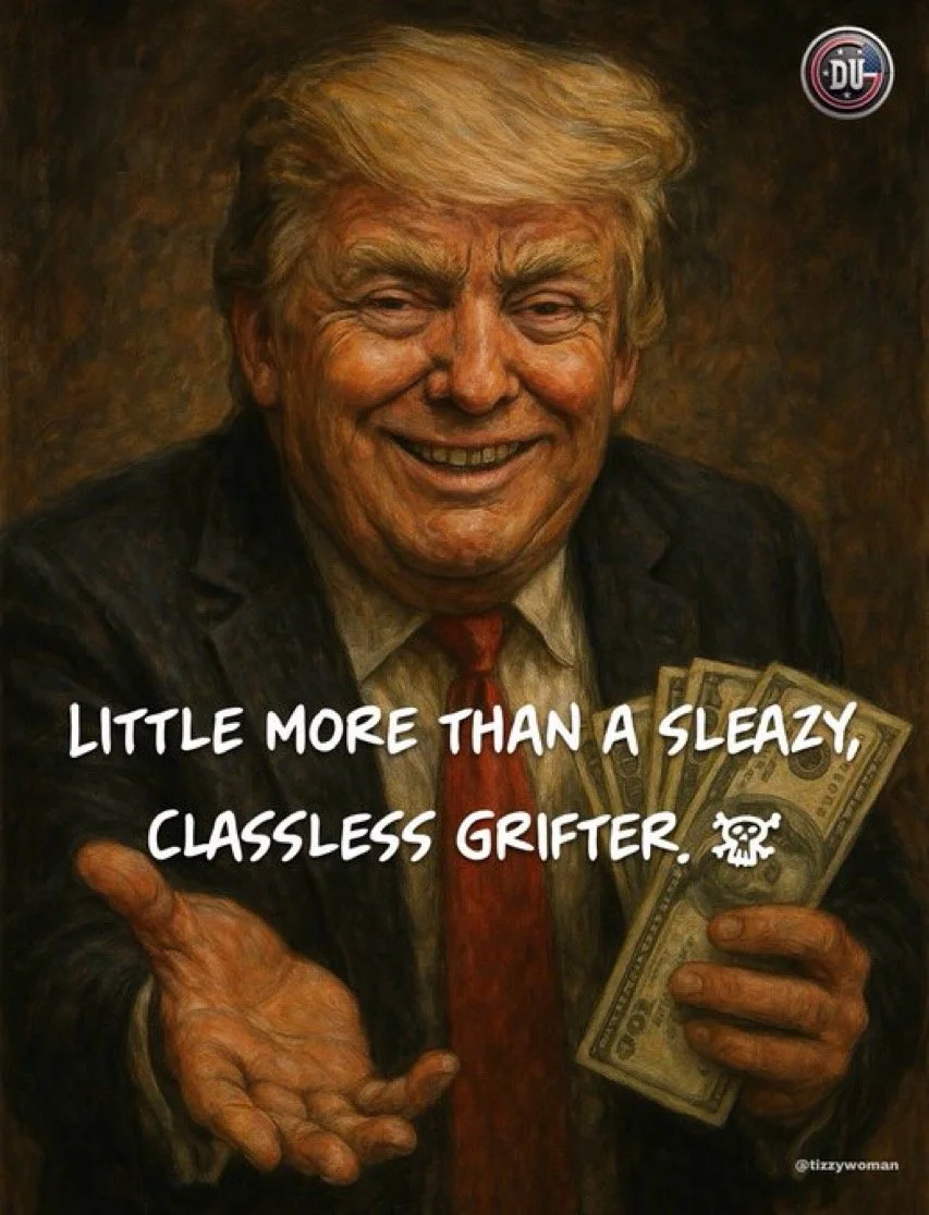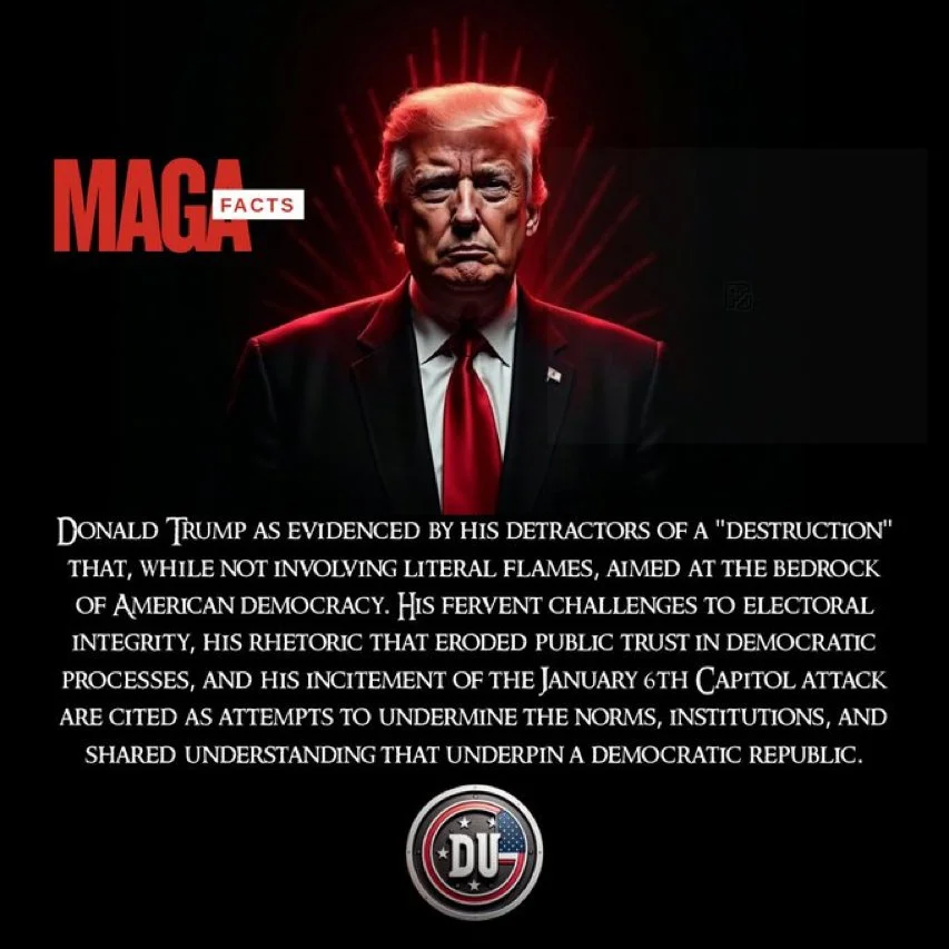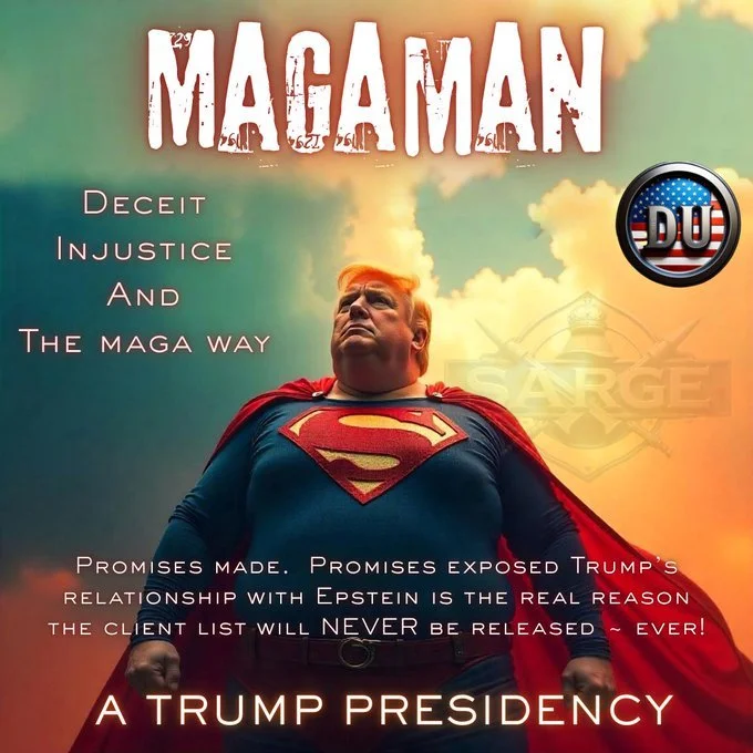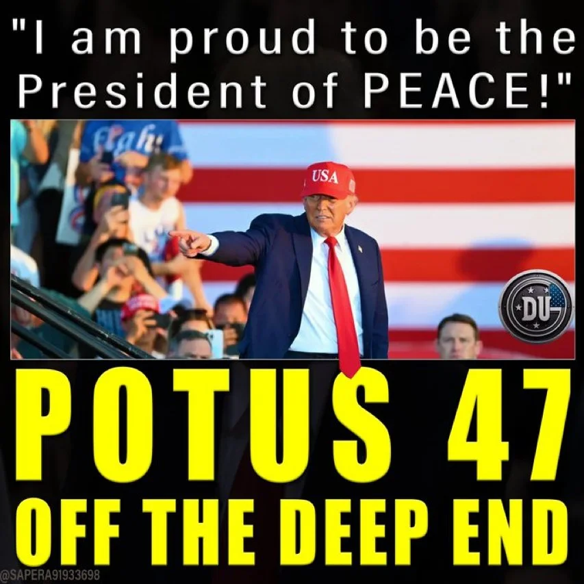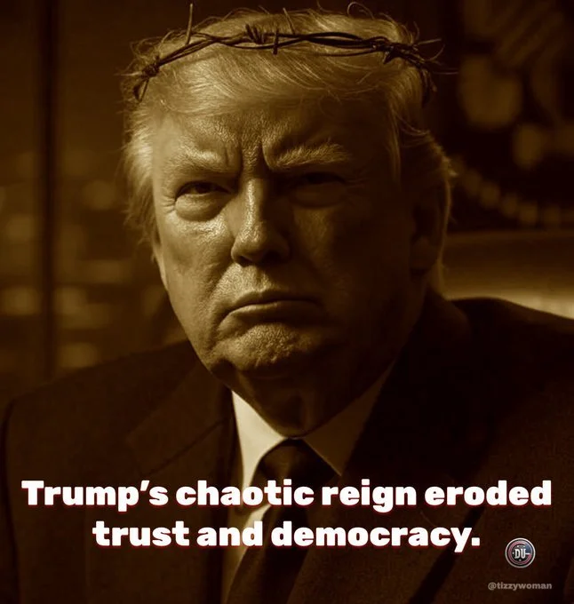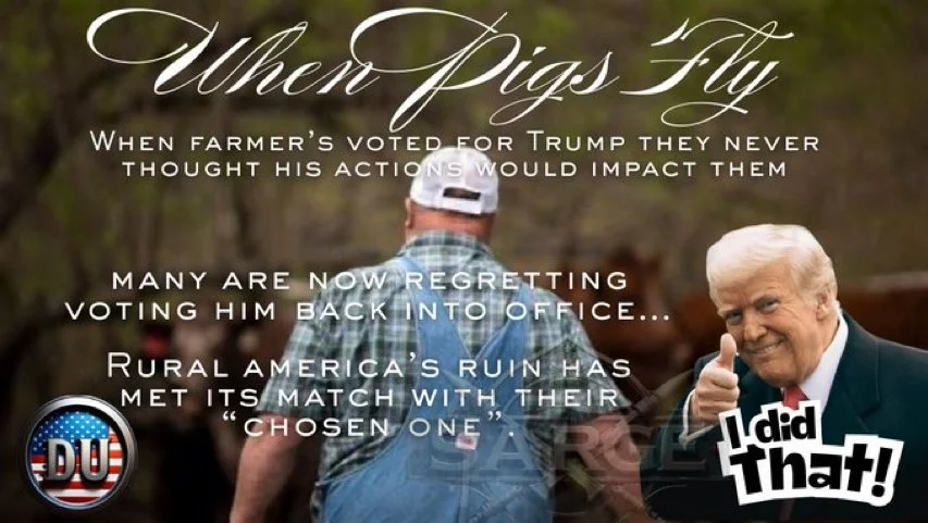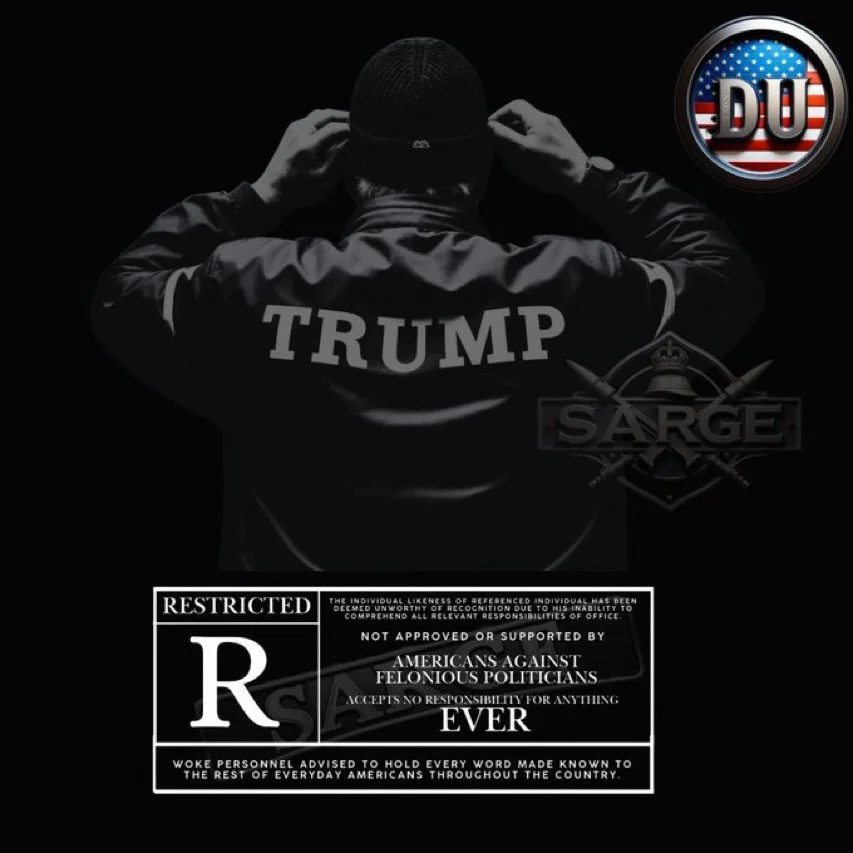 A photo of Donald Trump speaking at a podium with the text "POTUS 47 AGENDA" at the top. To the right, it lists four points: "NO ART, NO FOOD, NO HEALTH, NO SCIENCE" in yellow text. At the bottom, it says "BILLIONAIRES EXEMPT." There is a round seal or logo with the initials "DU" in the bottom right corner.