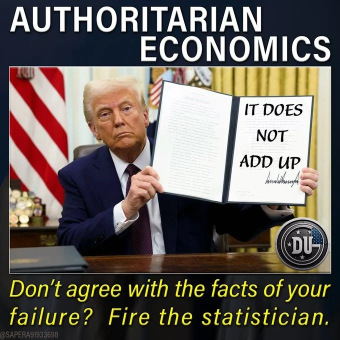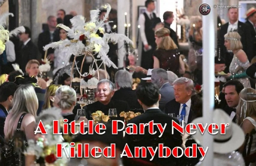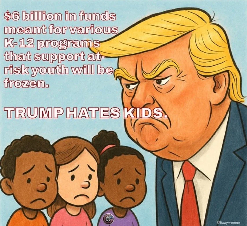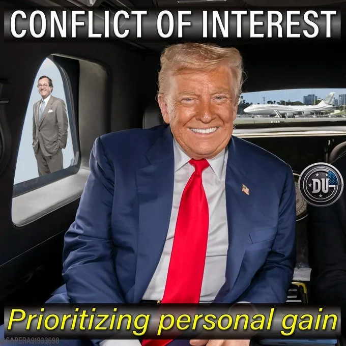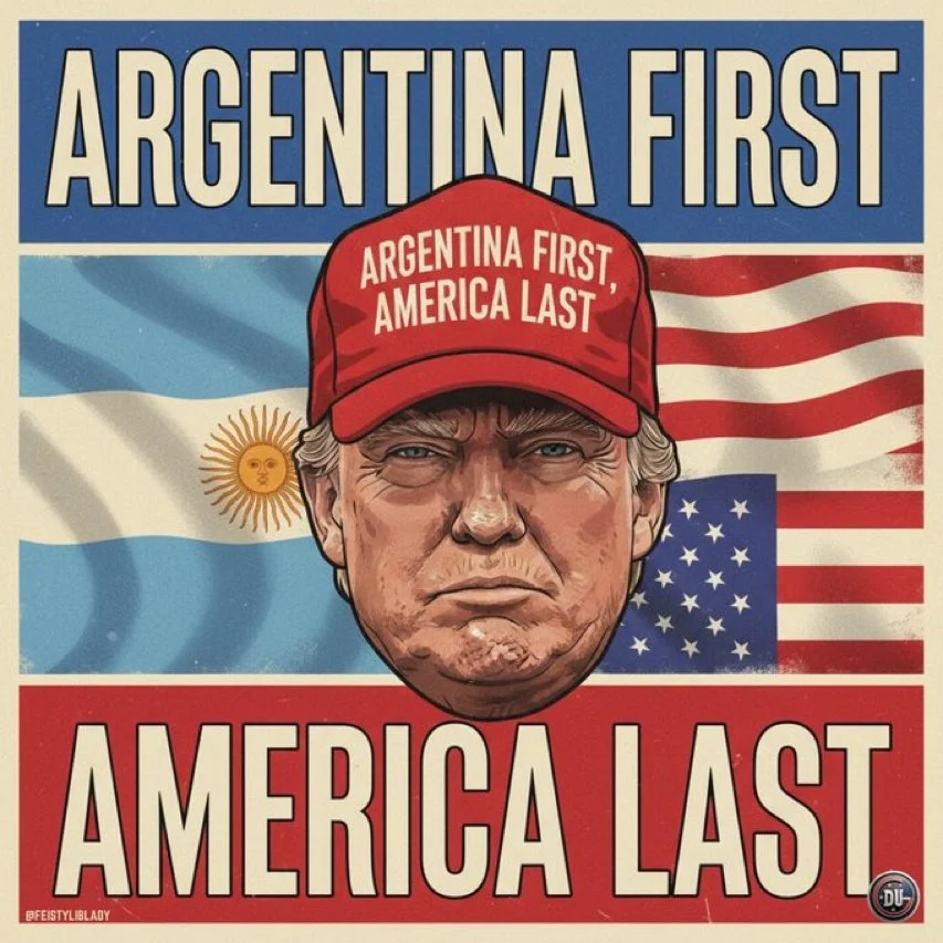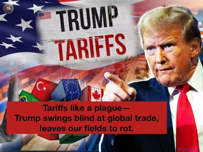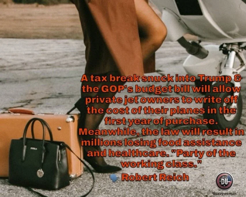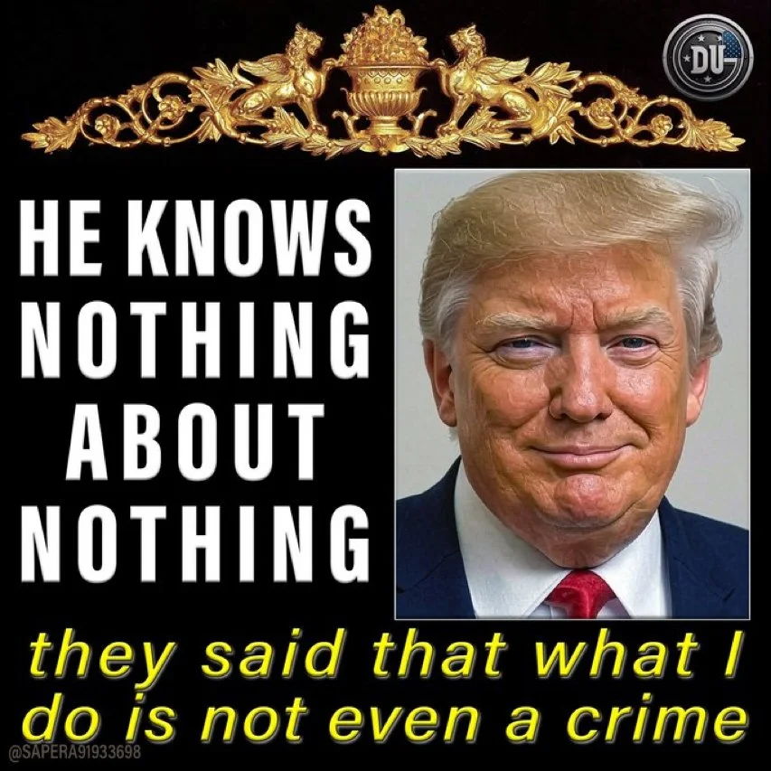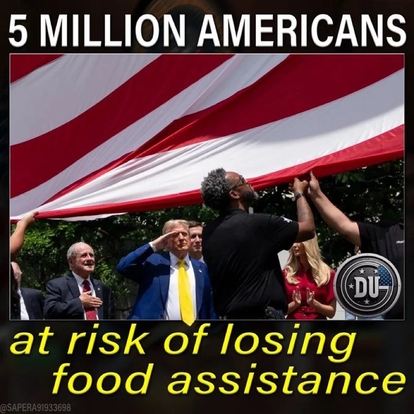 A photo of Donald Trump speaking at a podium with the text "POTUS 47 AGENDA" at the top. To the right, it lists four points: "NO ART, NO FOOD, NO HEALTH, NO SCIENCE" in yellow text. At the bottom, it says "BILLIONAIRES EXEMPT." There is a round seal or logo with the initials "DU" in the bottom right corner.