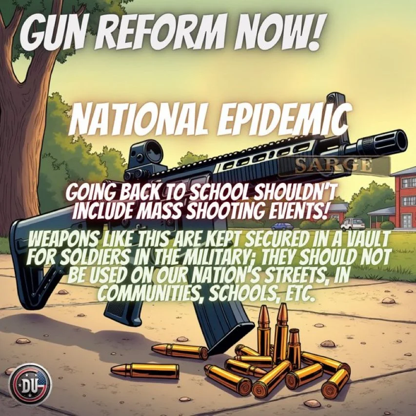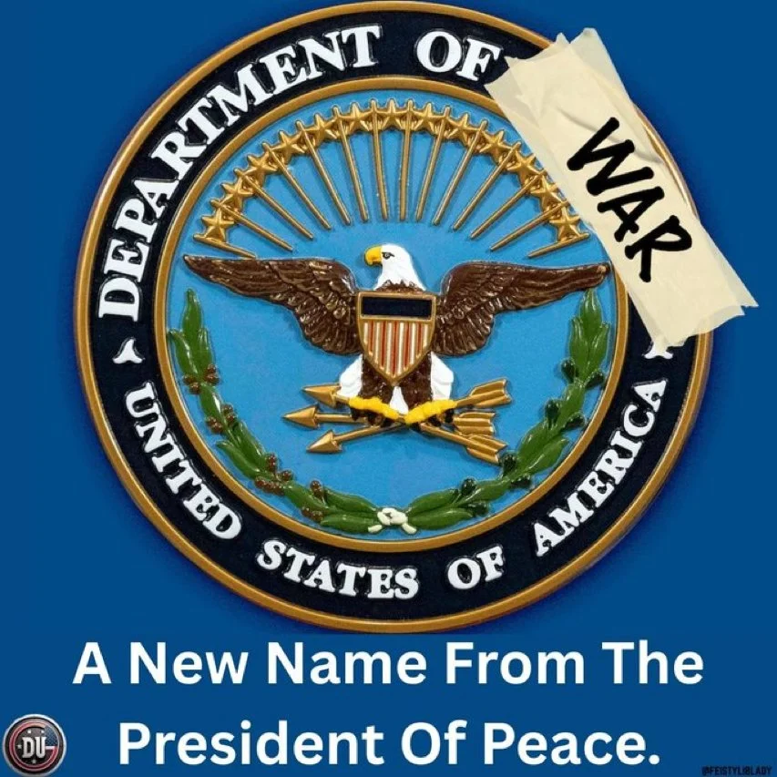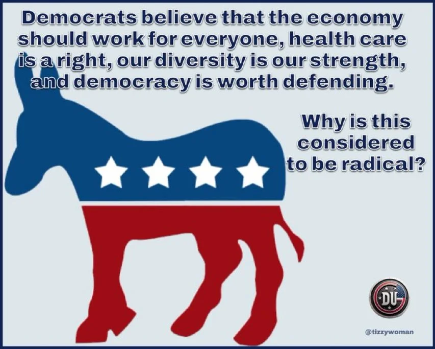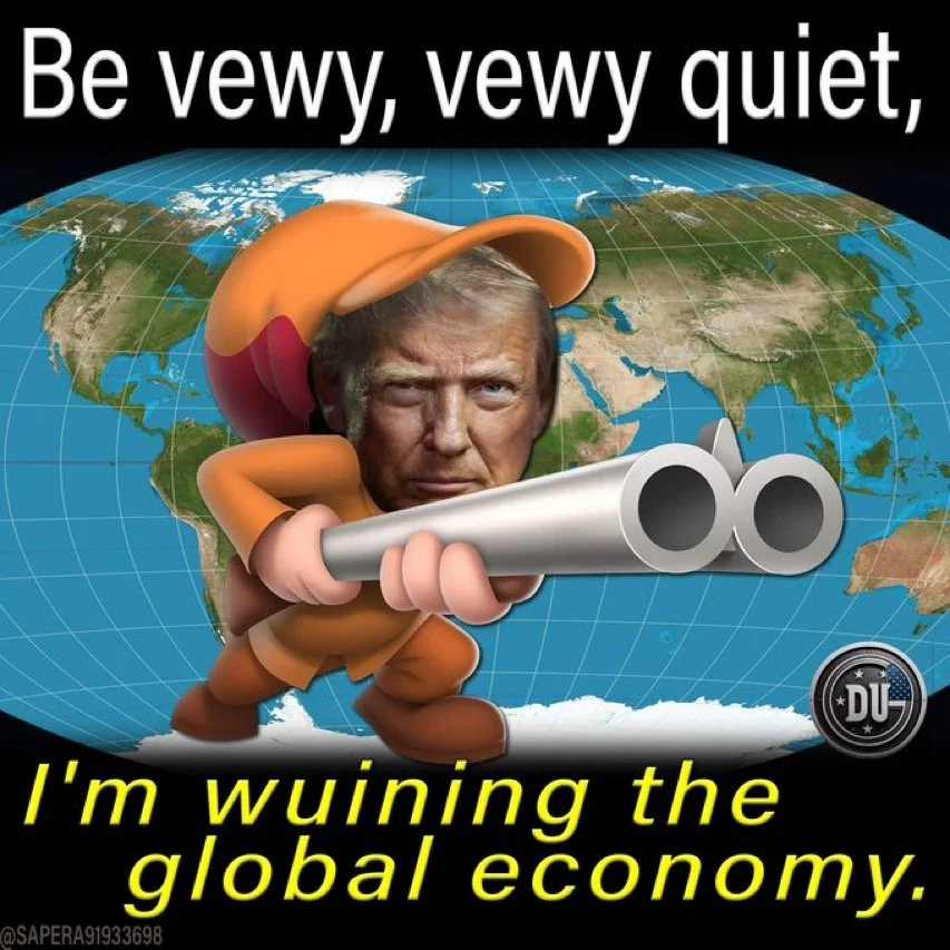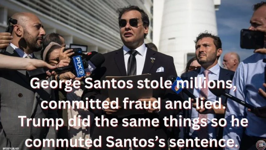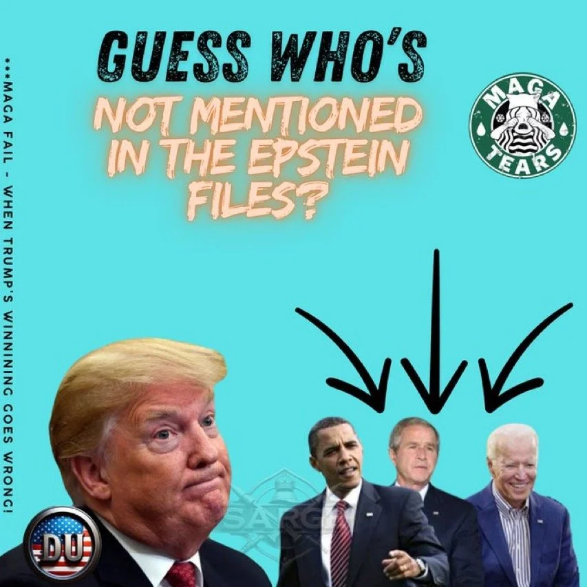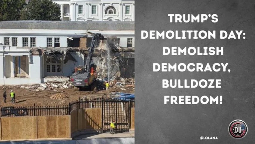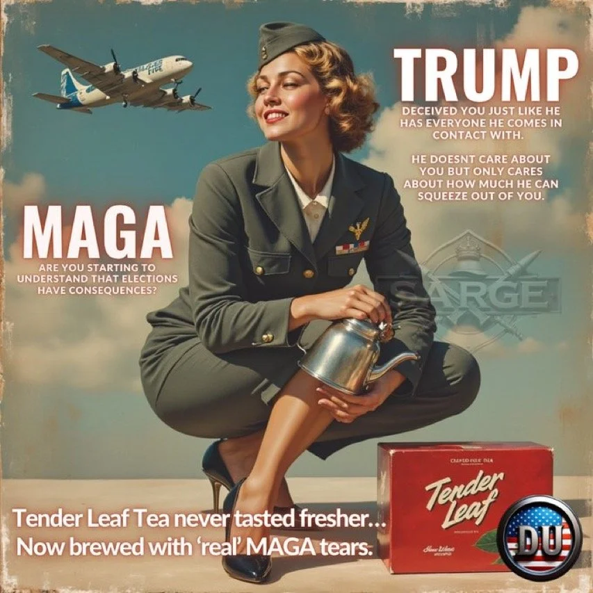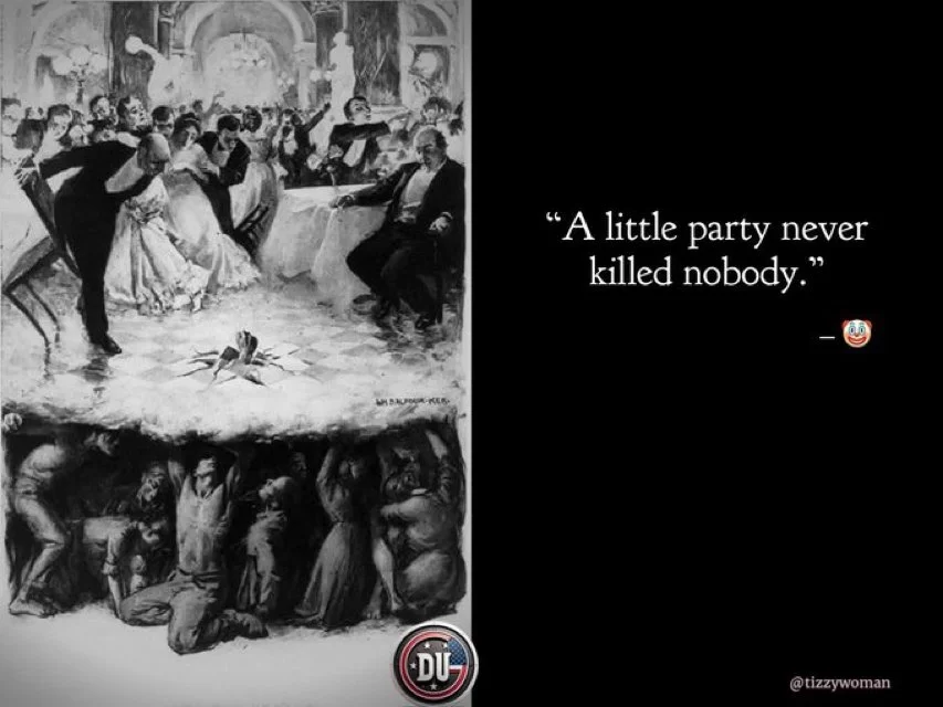 A photo of Donald Trump speaking at a podium with the text "POTUS 47 AGENDA" at the top. To the right, it lists four points: "NO ART, NO FOOD, NO HEALTH, NO SCIENCE" in yellow text. At the bottom, it says "BILLIONAIRES EXEMPT." There is a round seal or logo with the initials "DU" in the bottom right corner.