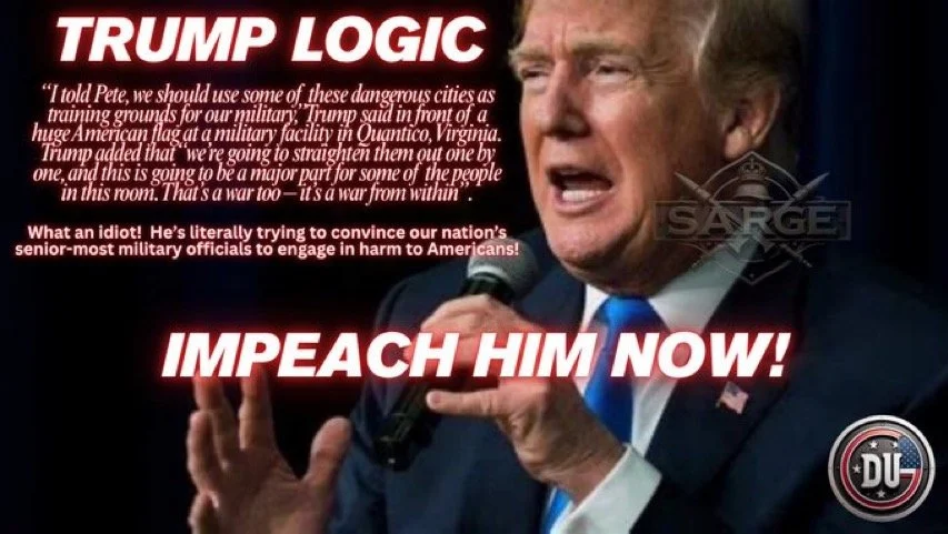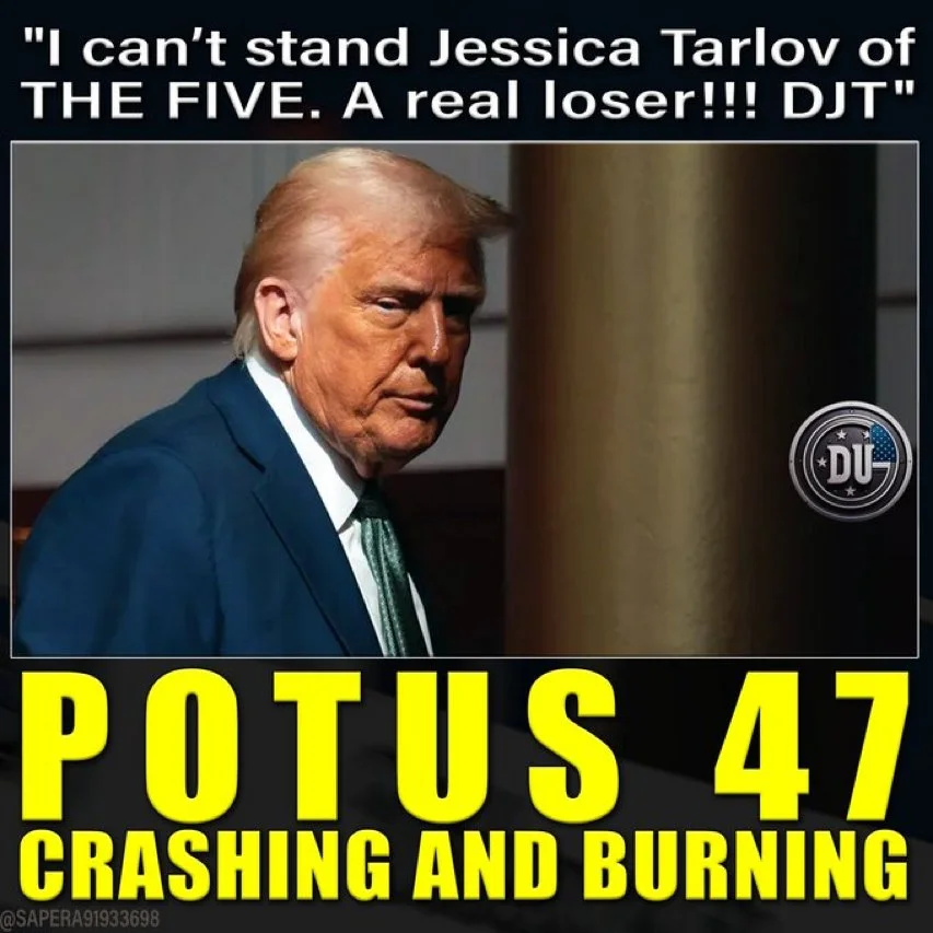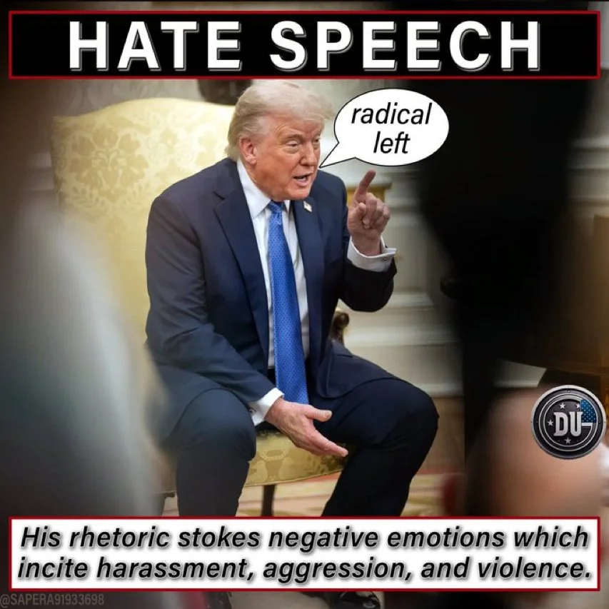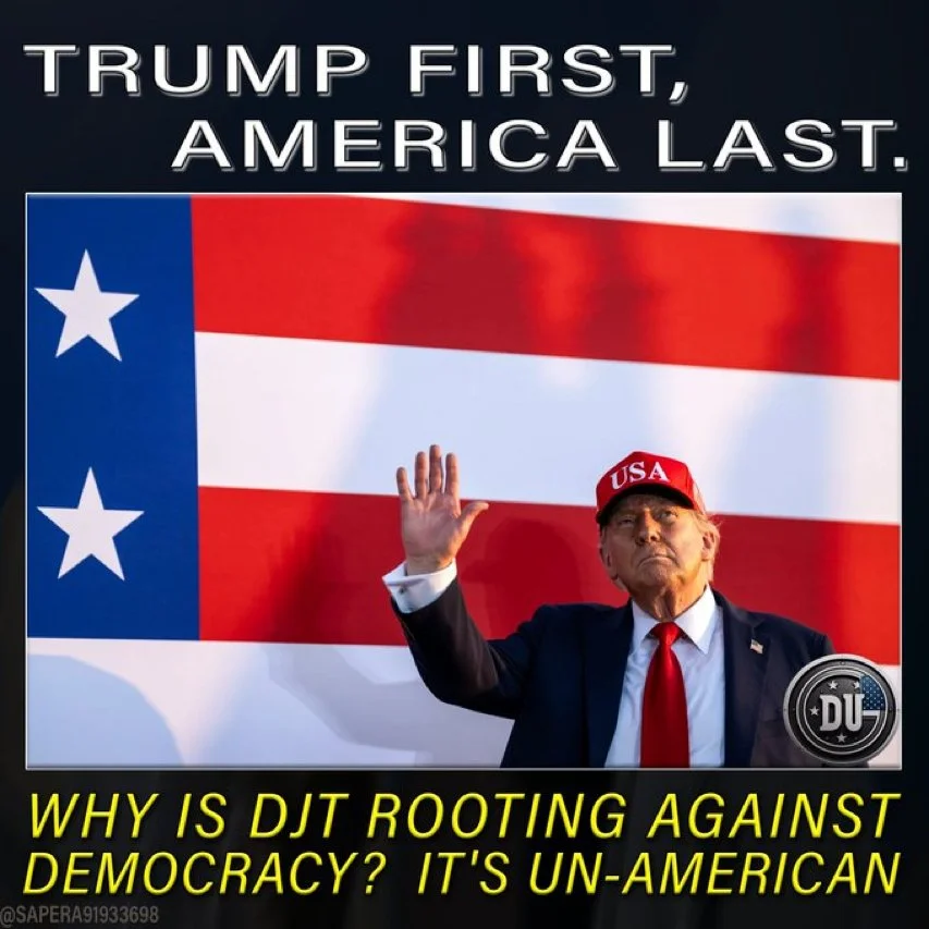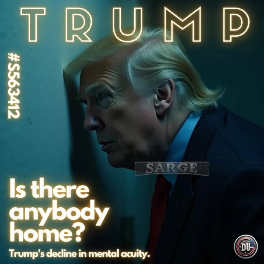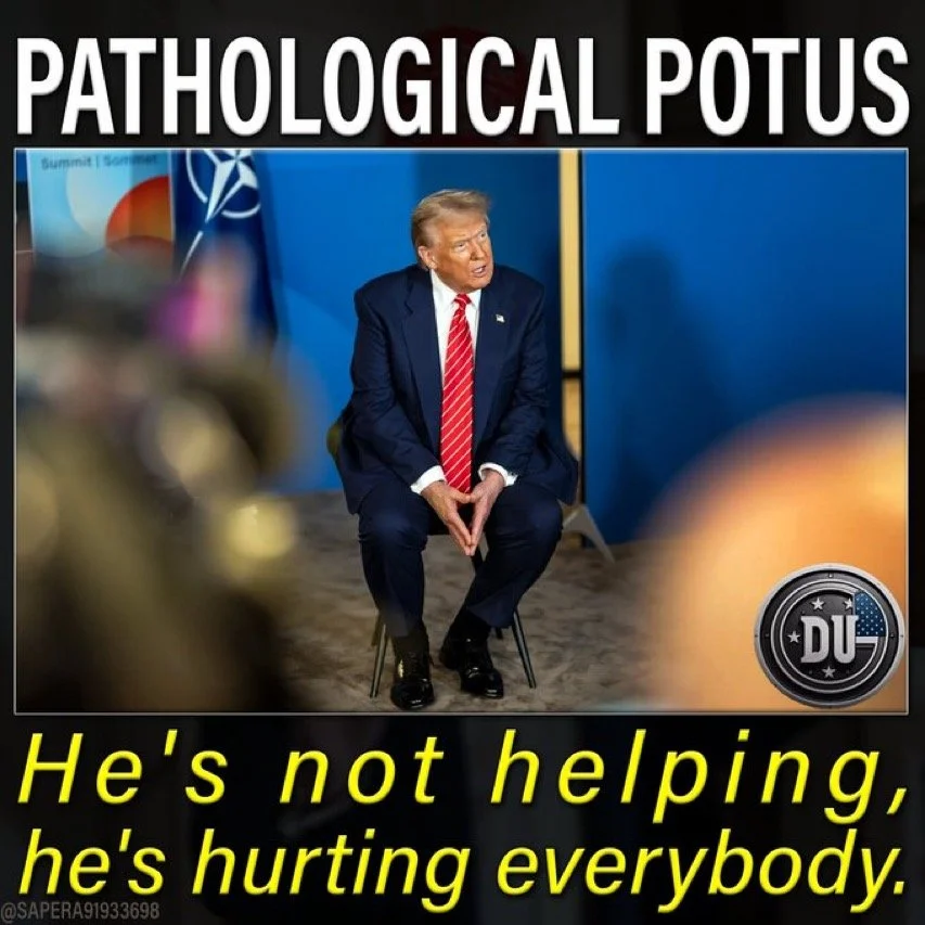 Photograph of Donald Trump sitting during an event, with the text 'PATHOLOGICAL POTUS' at the top and 'He's not helping, he's hurting everybody.' at the bottom, along with logos and branding.