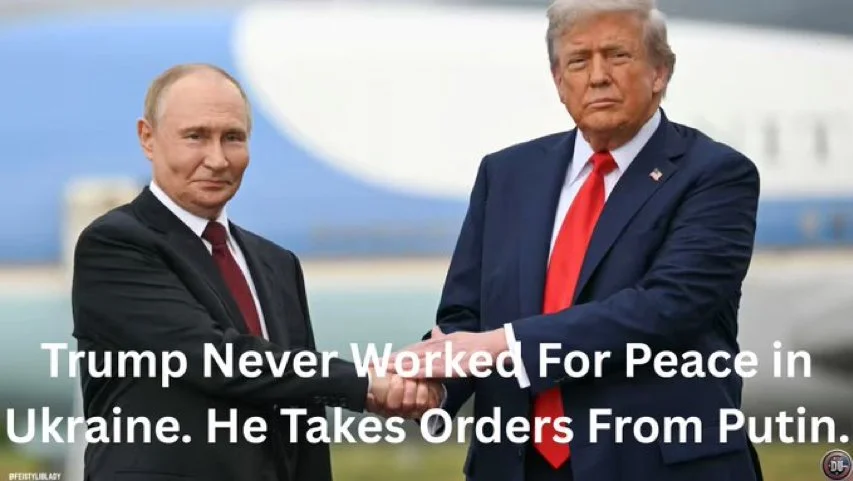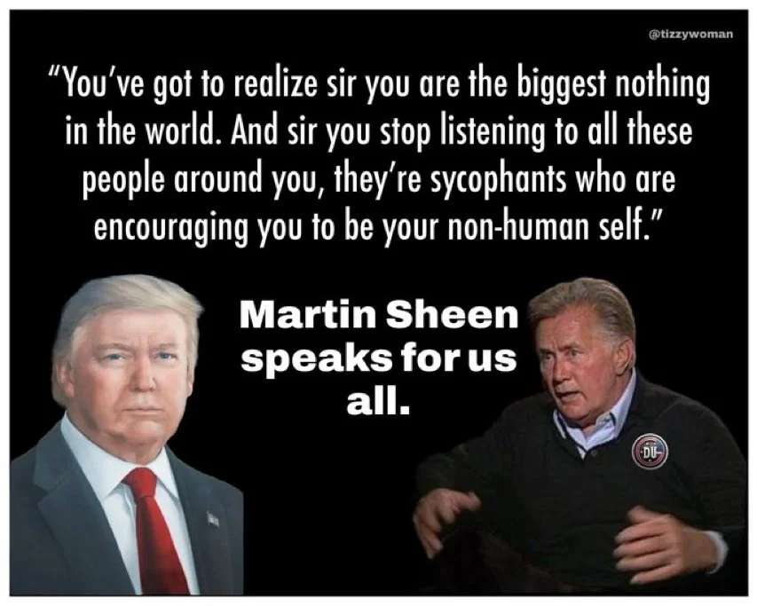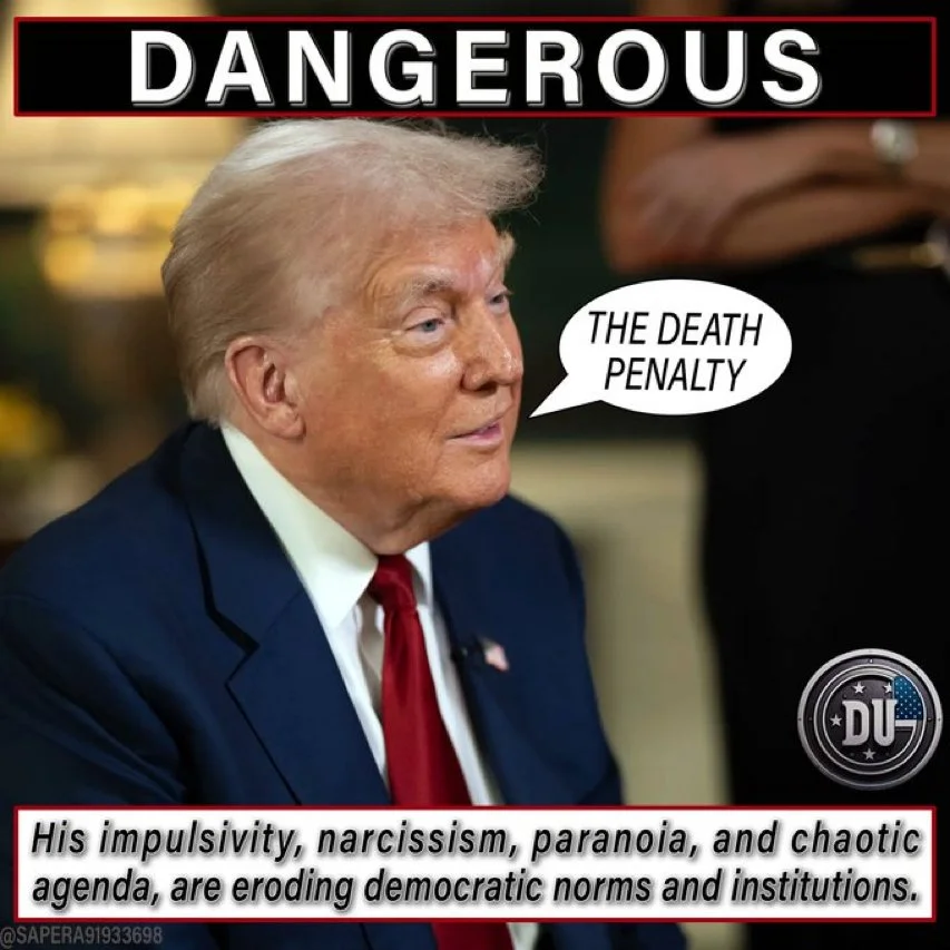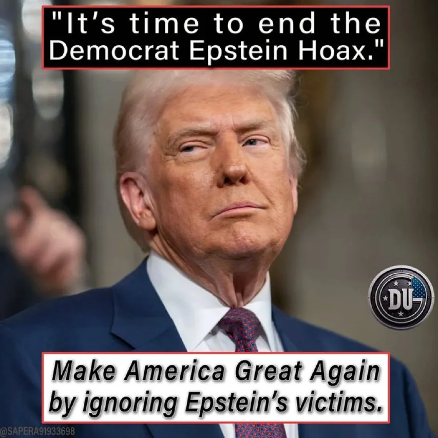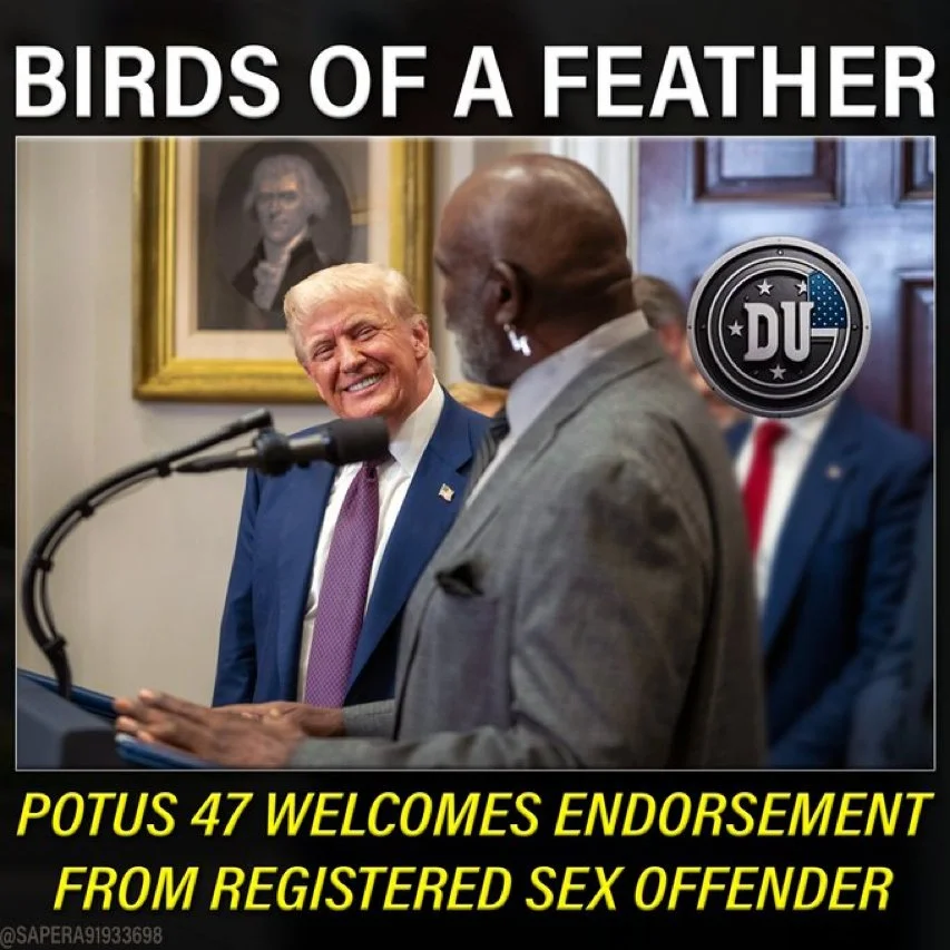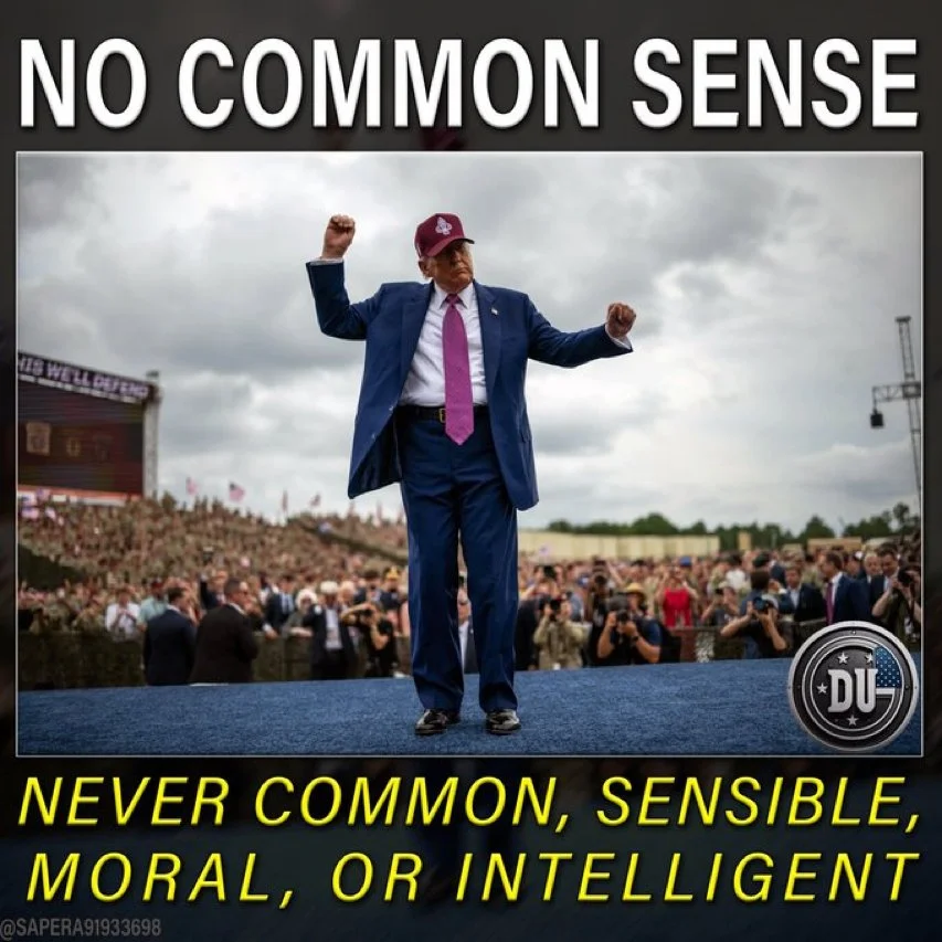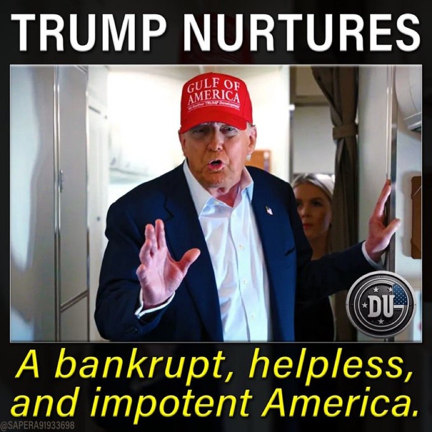 Photograph of Donald Trump sitting during an event, with the text 'PATHOLOGICAL POTUS' at the top and 'He's not helping, he's hurting everybody.' at the bottom, along with logos and branding.
