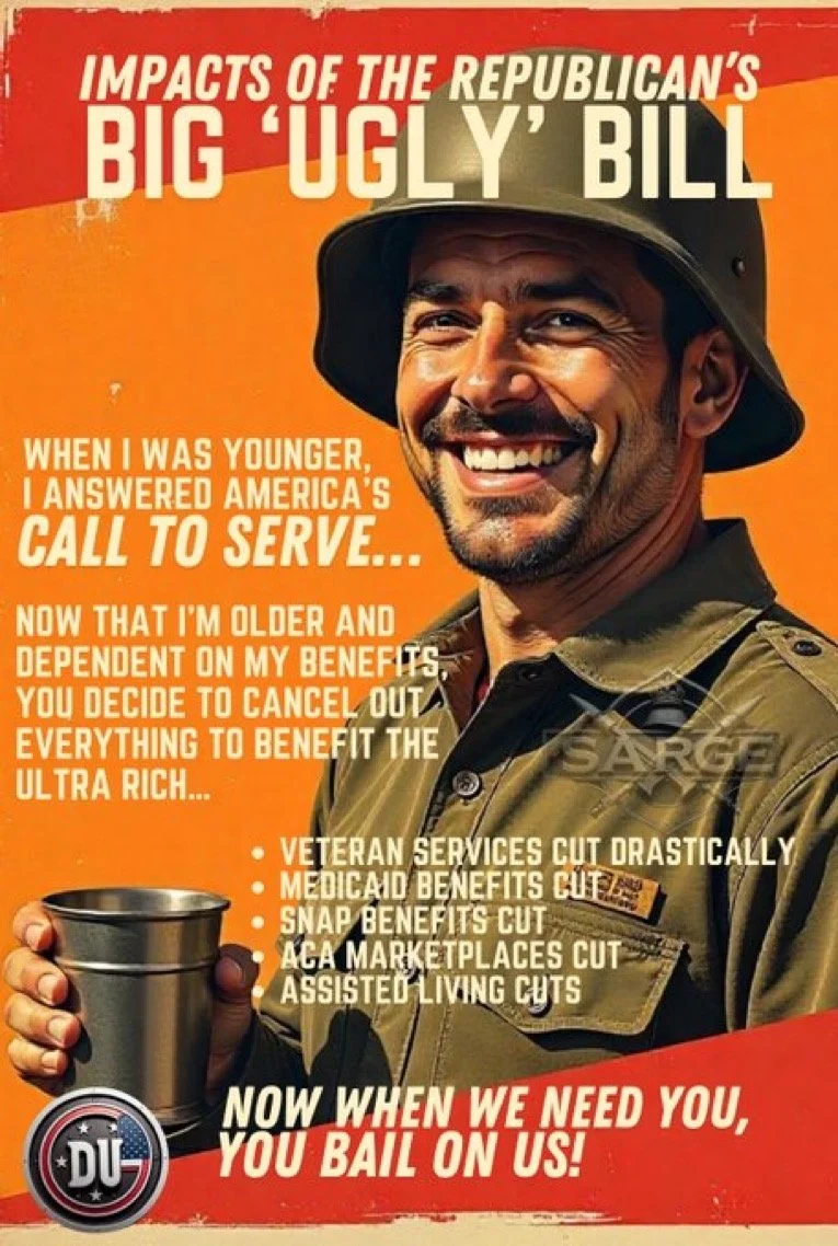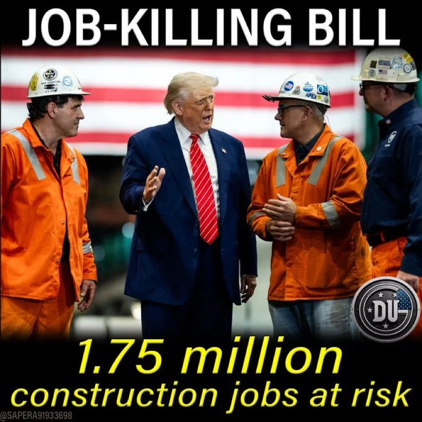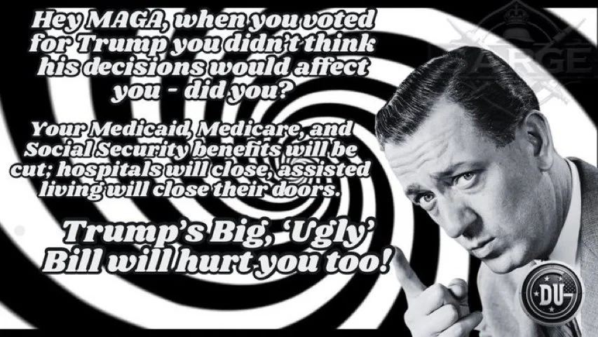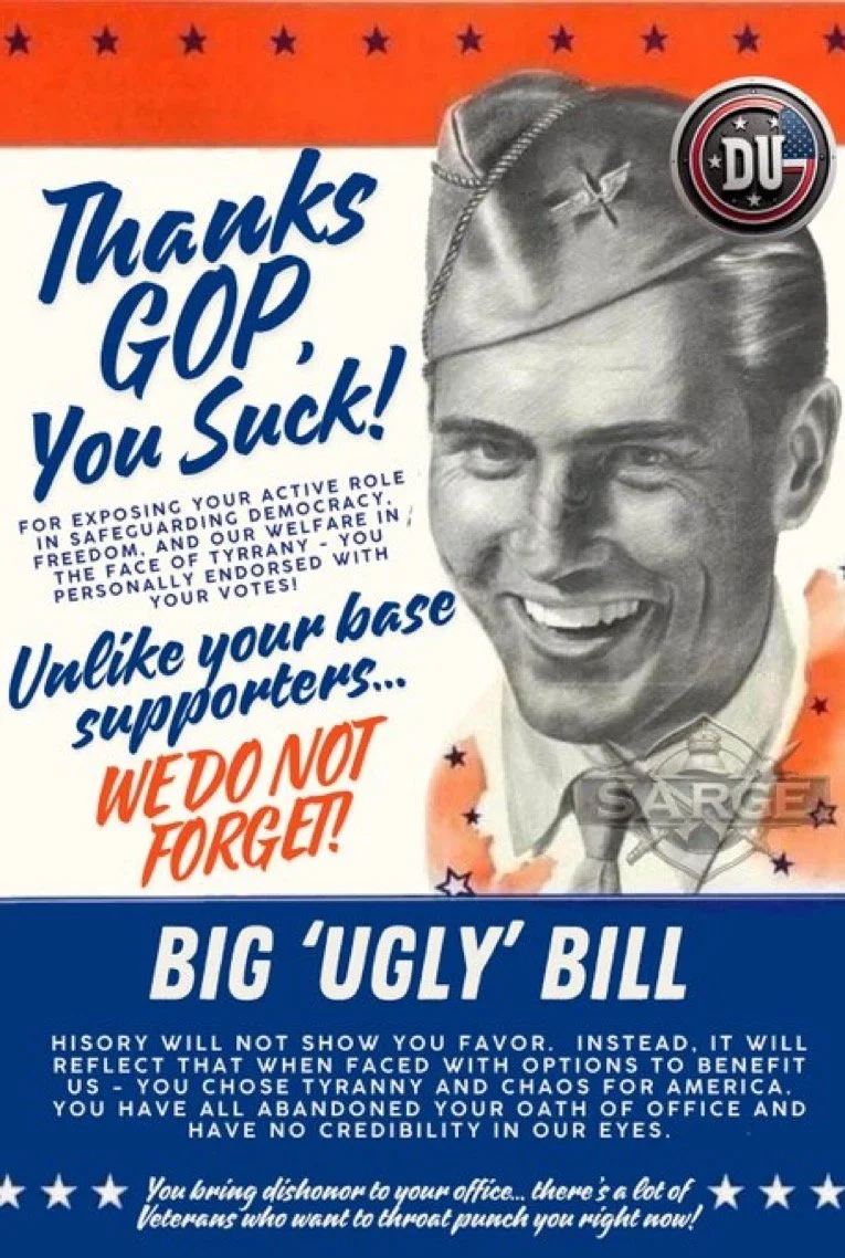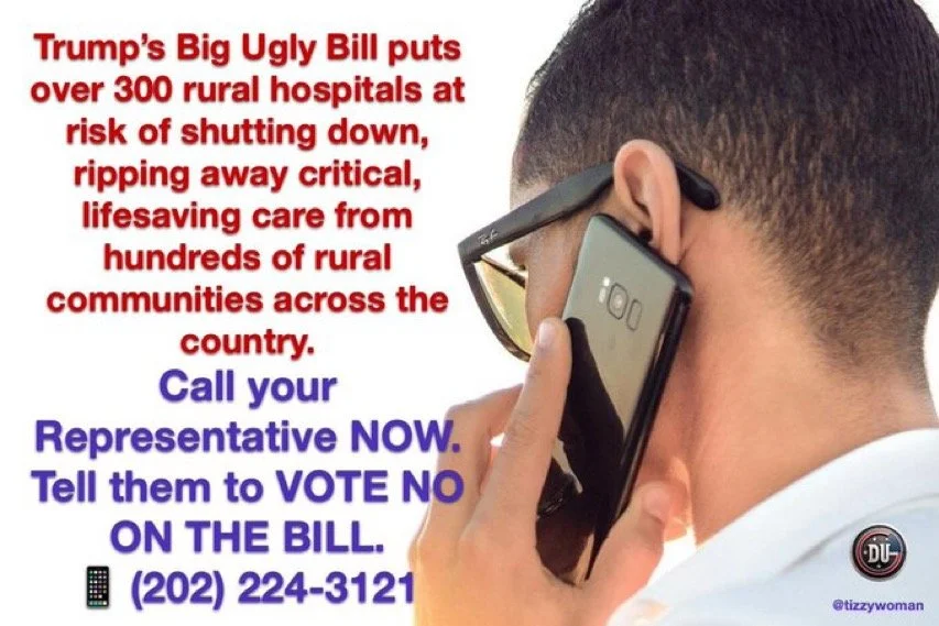 A group of politicians standing in a room with a man at the center speaking at a podium holding a sign that reads 'ONE BILL A BEAUTIFUL BILL ACT'. A large red prohibition symbol is over the man. The text at the top says 'KILL THE BILL.' The text at the bottom says 'The life-threatening consequences will affect everyone.'