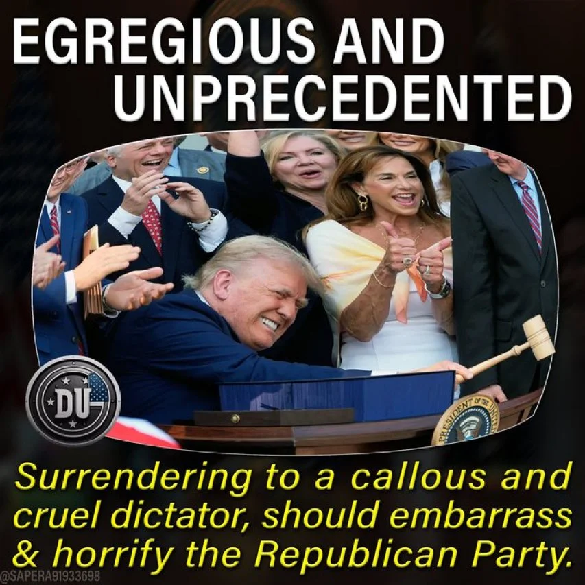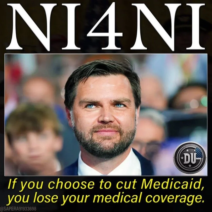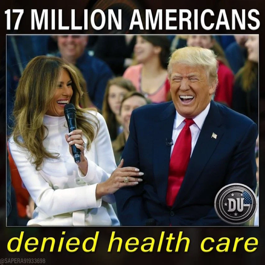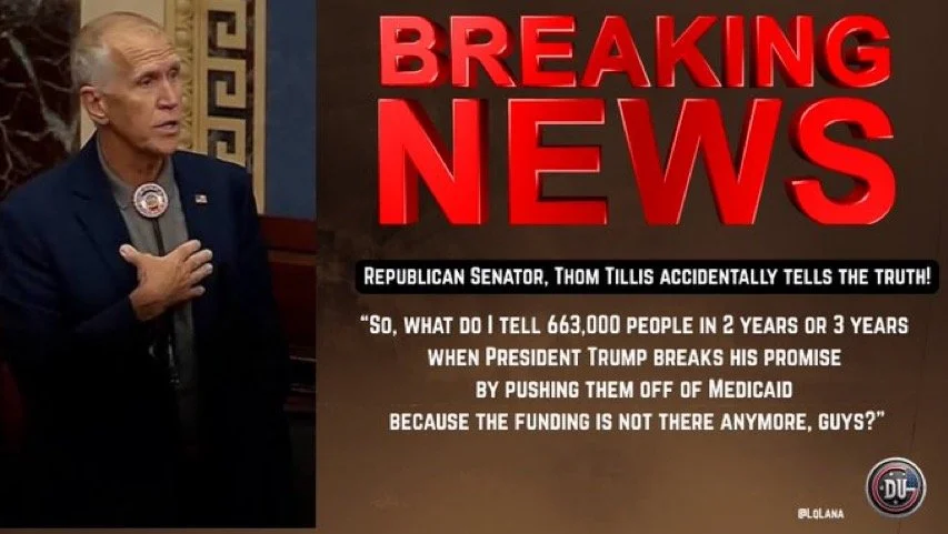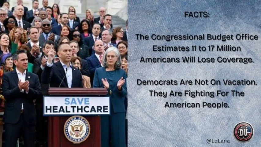 A group of politicians standing in a room with a man at the center speaking at a podium holding a sign that reads 'ONE BILL A BEAUTIFUL BILL ACT'. A large red prohibition symbol is over the man. The text at the top says 'KILL THE BILL.' The text at the bottom says 'The life-threatening consequences will affect everyone.'
