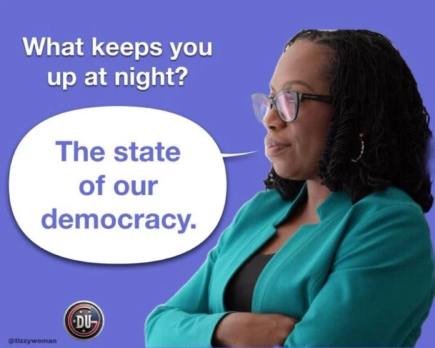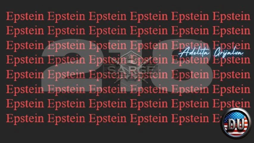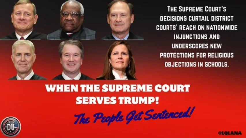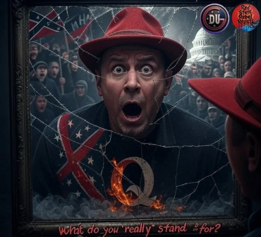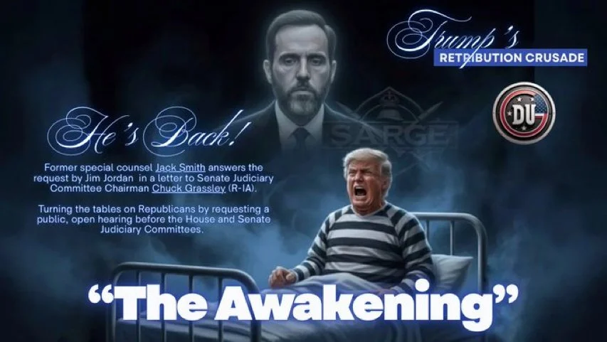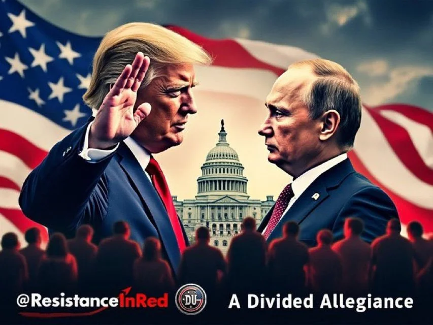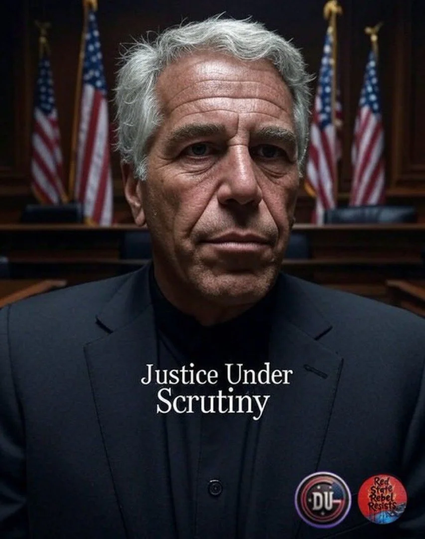 A serious-looking man with gray hair wearing a dark suit, standing in front of multiple American flags in a courtroom setting, with the text "Justice Under Scrutiny" at the bottom and two circular badges, one with the initials "DU" and another with the phrase "Red State Rebel Resists."