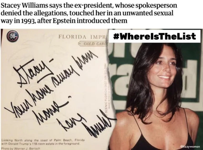 A woman with dark hair wearing a black top, smiling, standing in front of a sign with partially visible text. There is a handwritten note or autograph on a piece of paper in the foreground and a hashtag #WhereIsTheList.