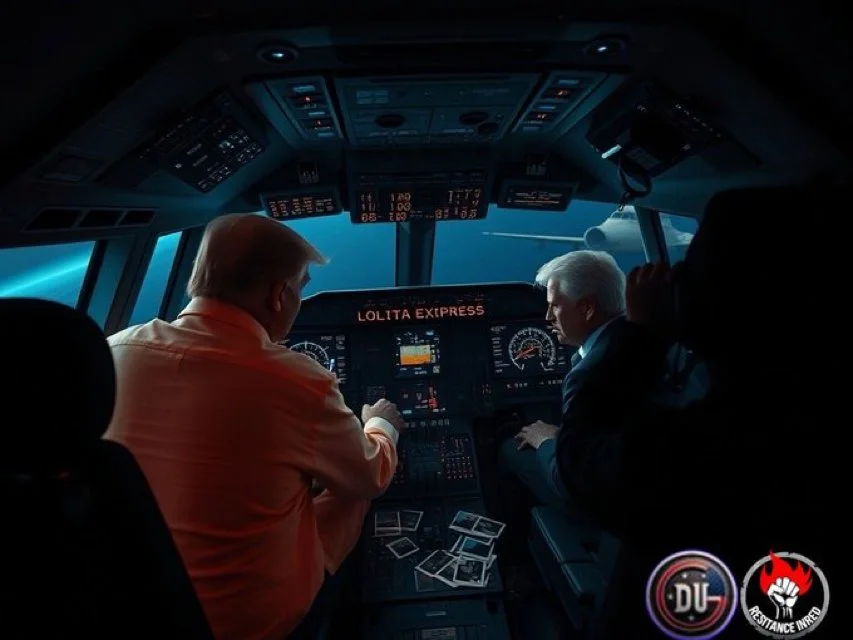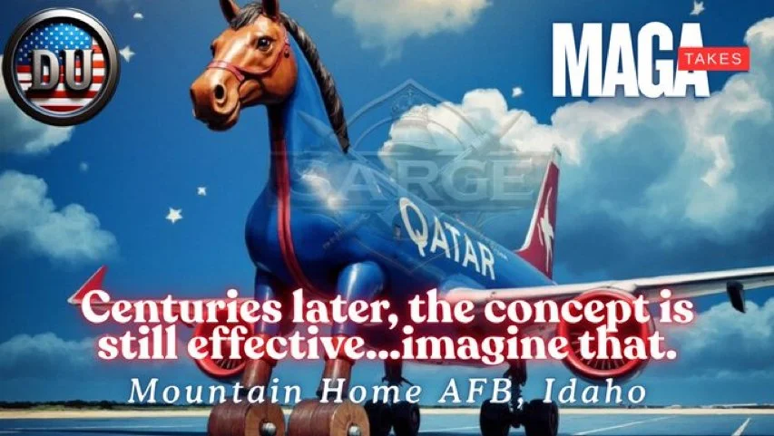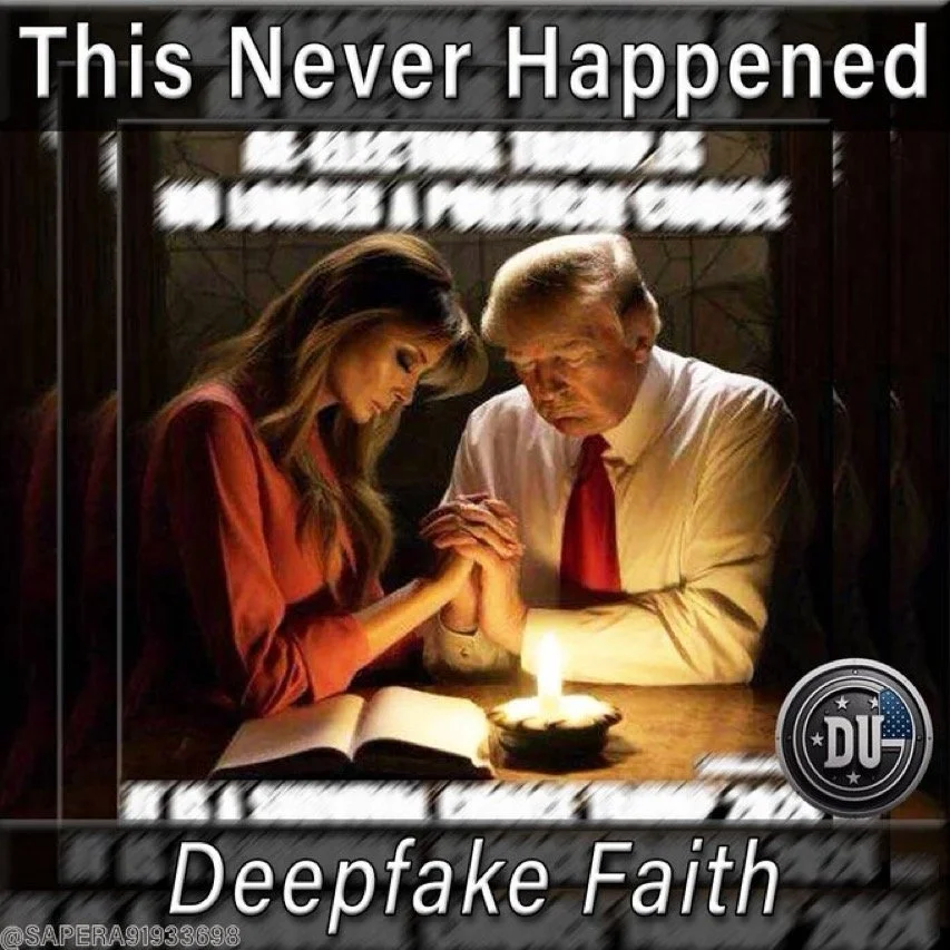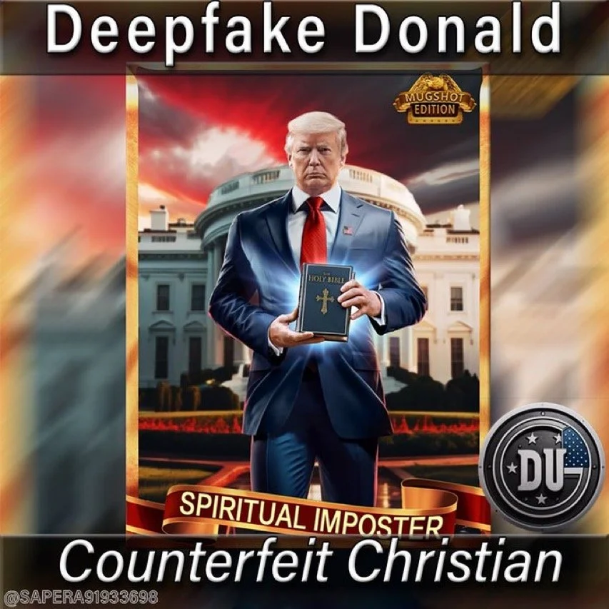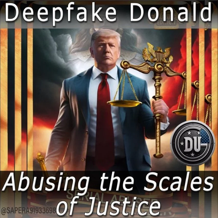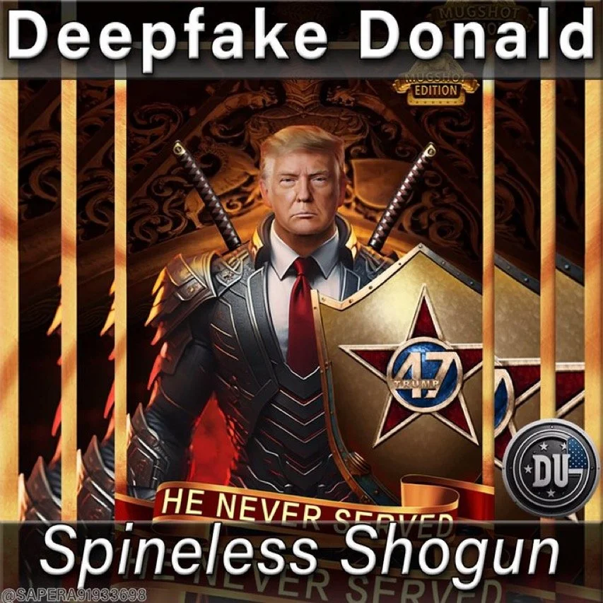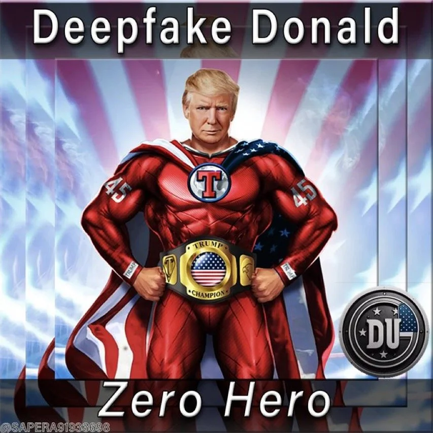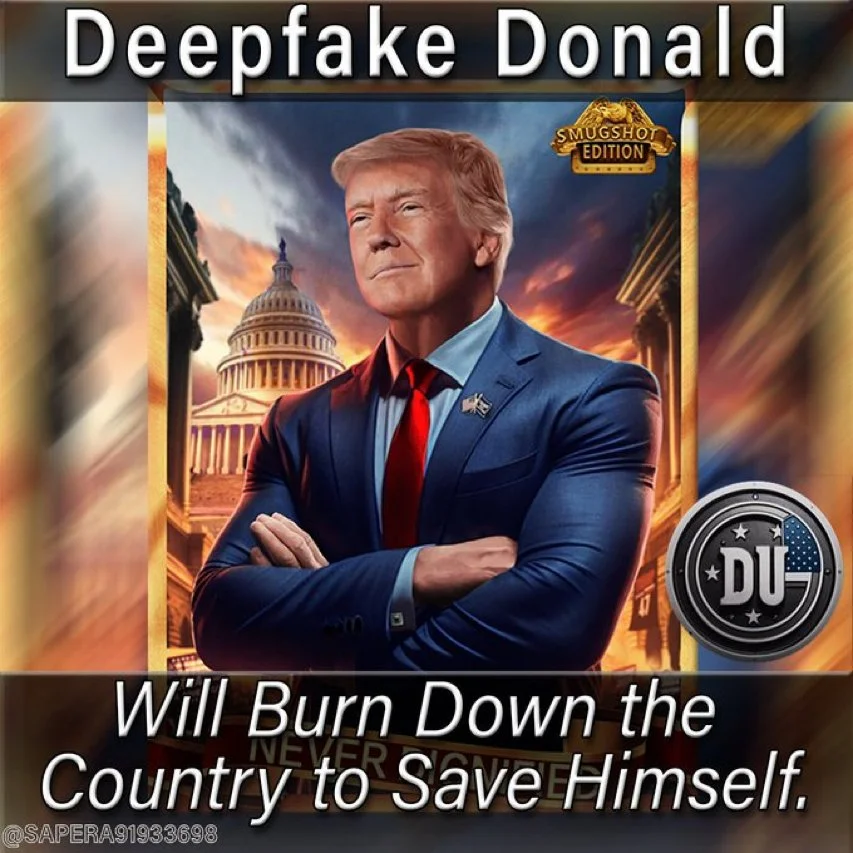 A digitally altered photo of Donald Trump sitting on an airplane. The image has humorous text that reads 'Deepfake Donald' at the top and 'More Annoying than any Crying Baby' at the bottom, and includes various badges and logos.