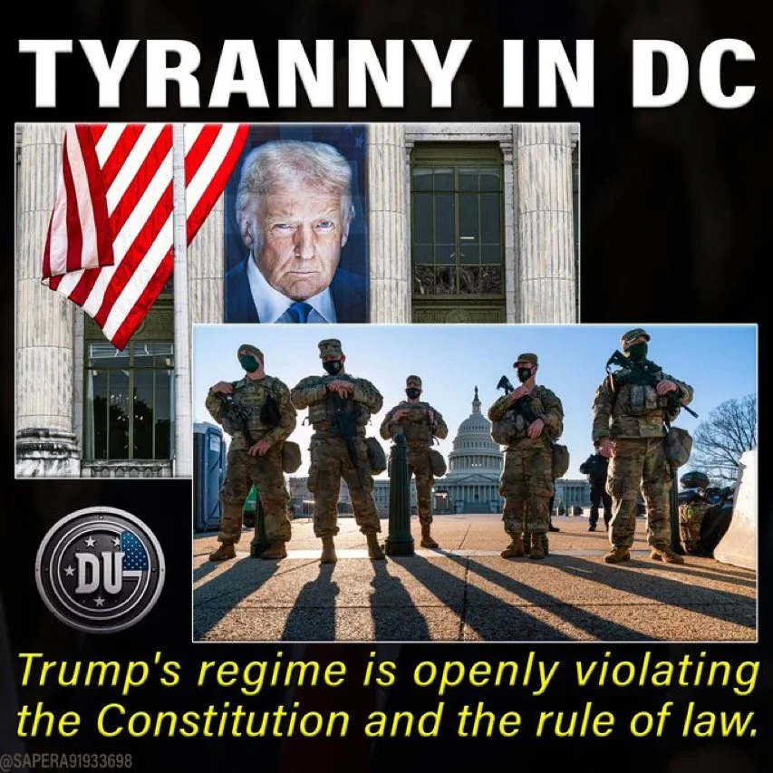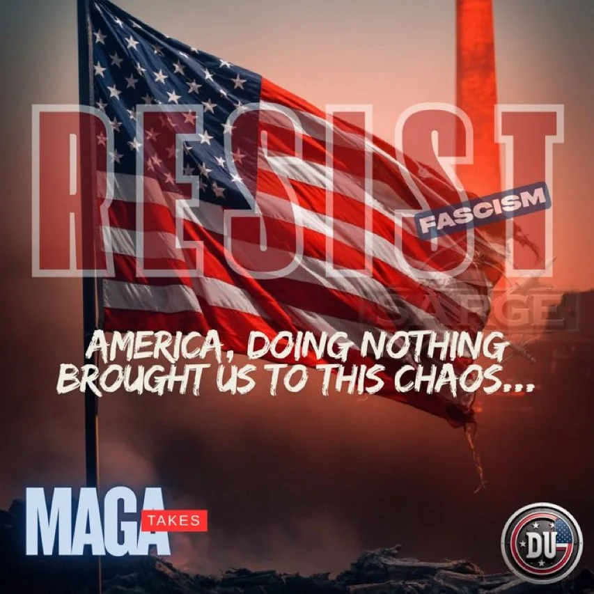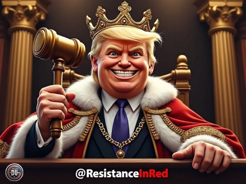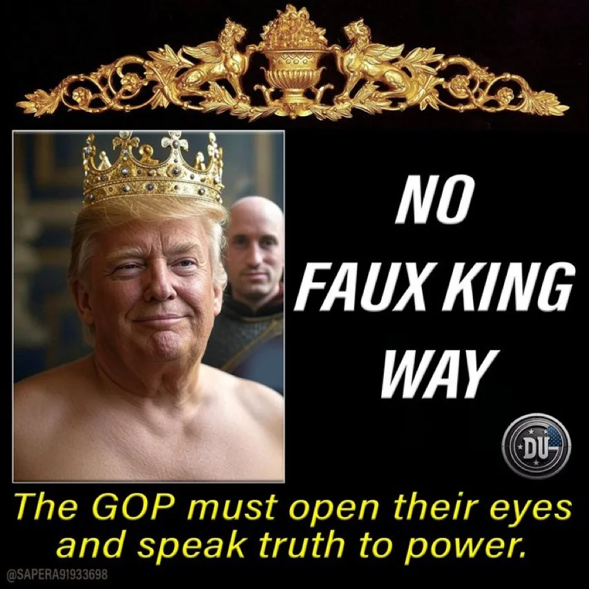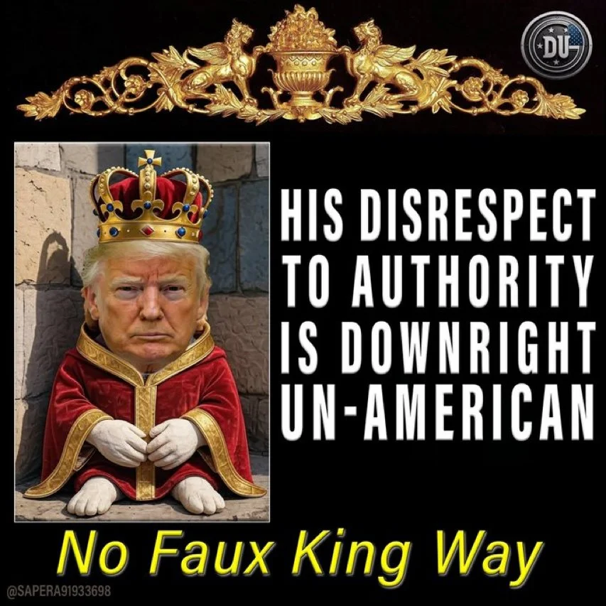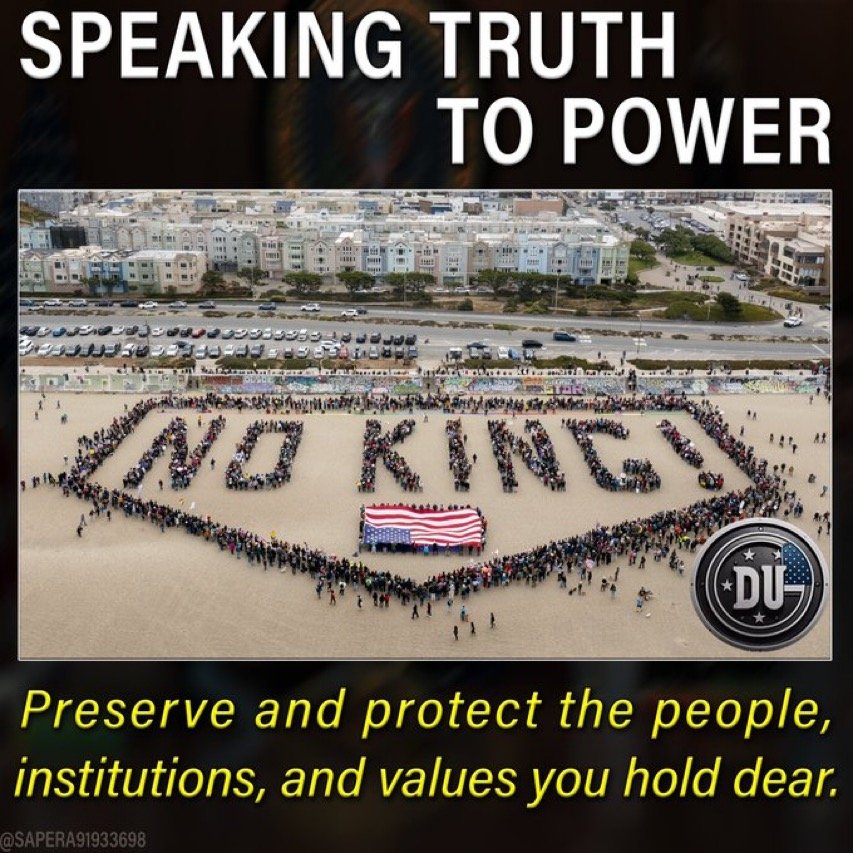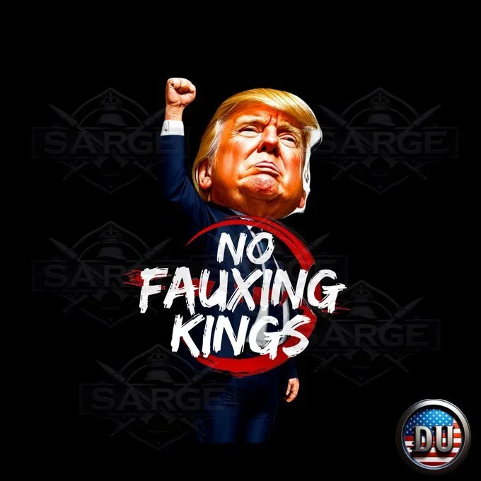 A man with gray hair sitting on the street against a wall, looking distressed. The image features text promoting No Kings Day on June 14th, with a message about unity and freedom, and symbols including a 50/50/1 logo and a patriotic emblem.
