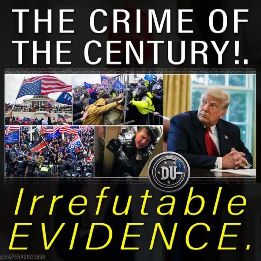 A compilation of images showing political protests, a police confrontation, and a formal meeting, with the overlay text "The Crime of the Century! Irrefutable Evidence."