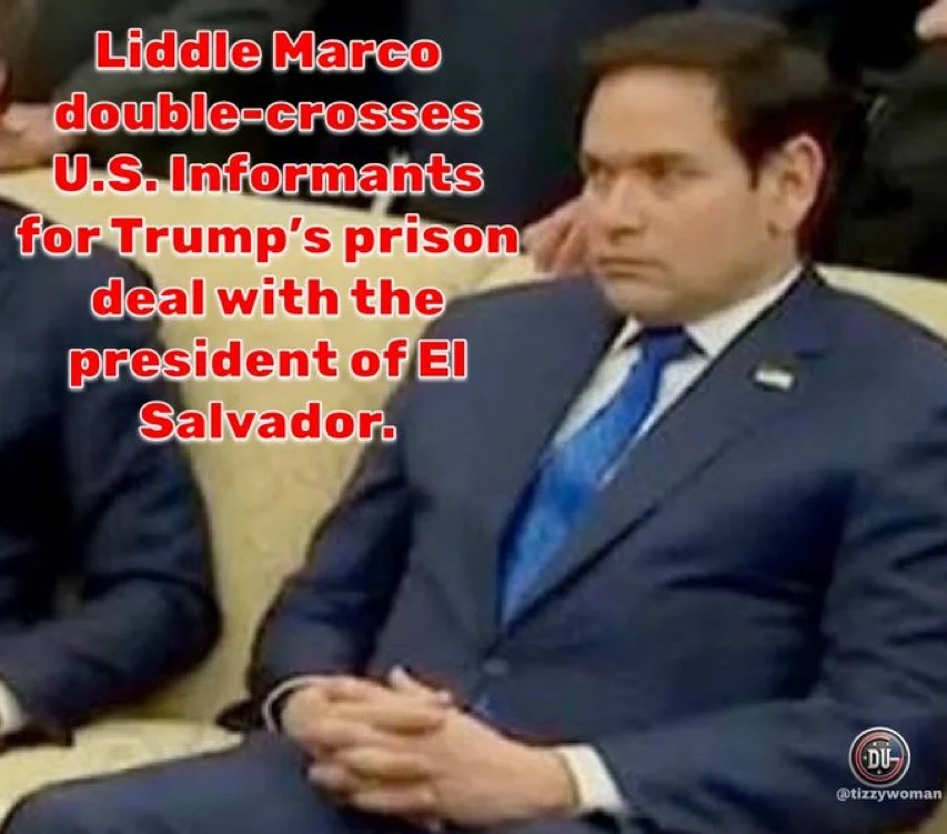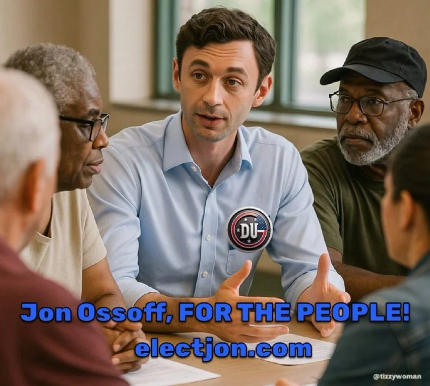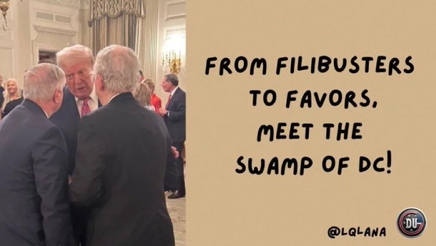 Three older men in suits engaged in conversation at a social gathering in an elegant room, with additional people in the background; a beige wall with black text that reads, "From filibusters to favors, meet the swamp of DC!" and a logo on the bottom right.