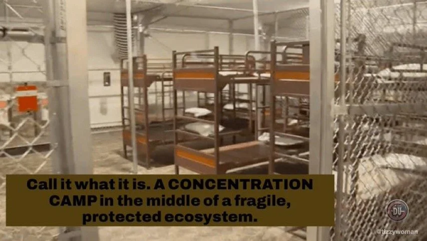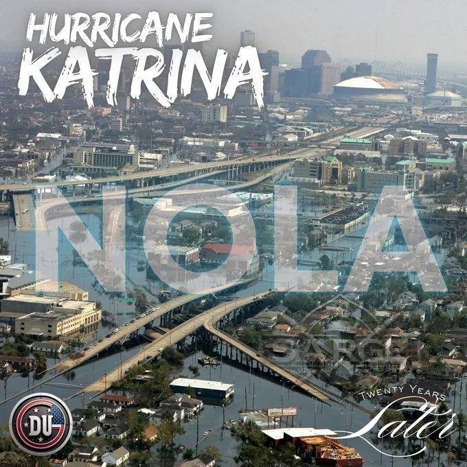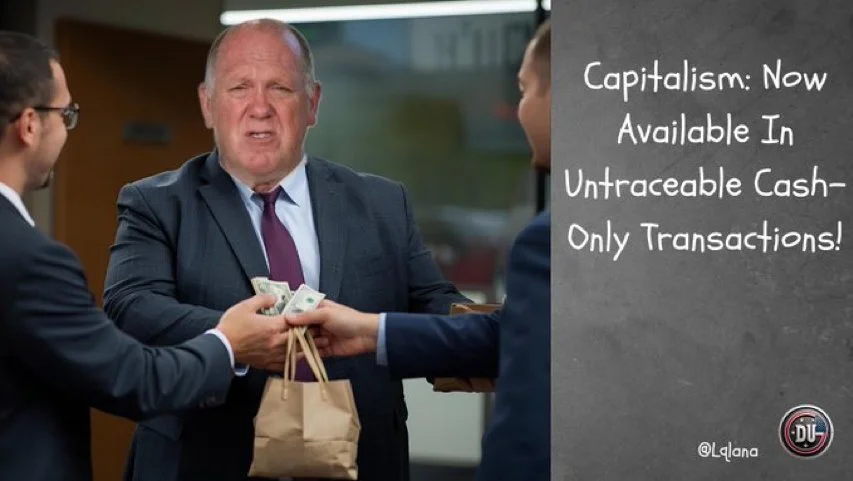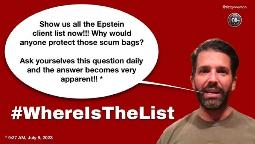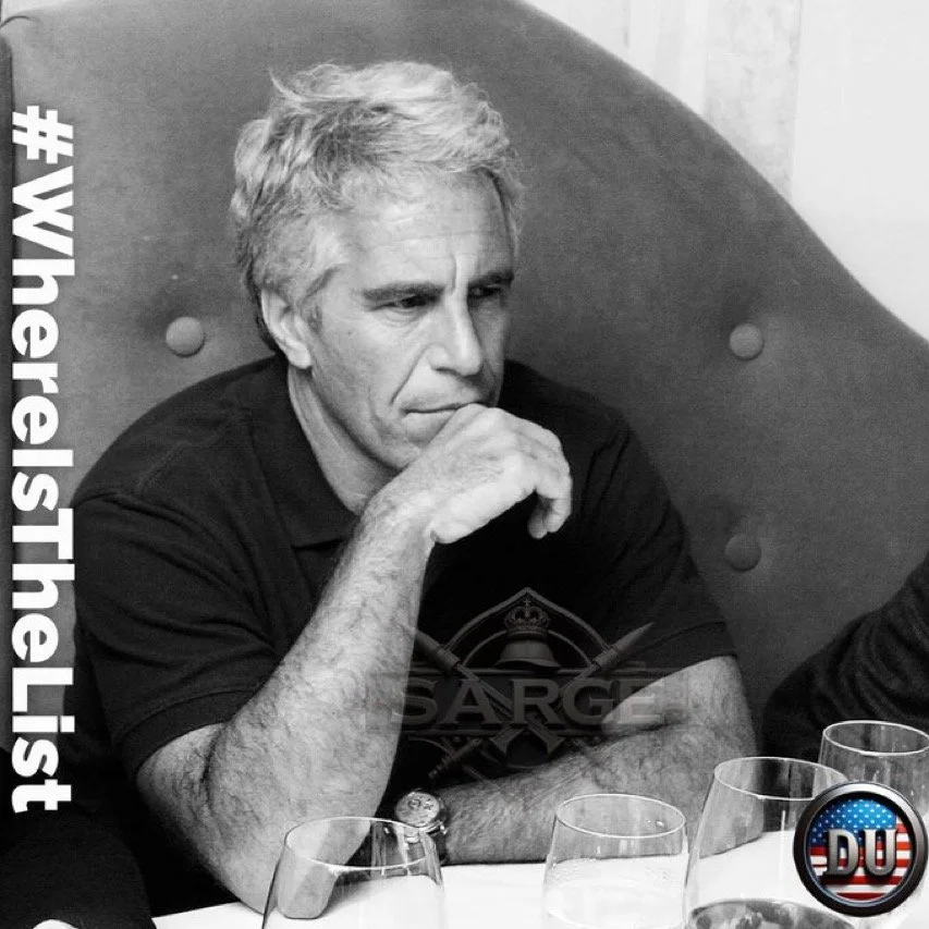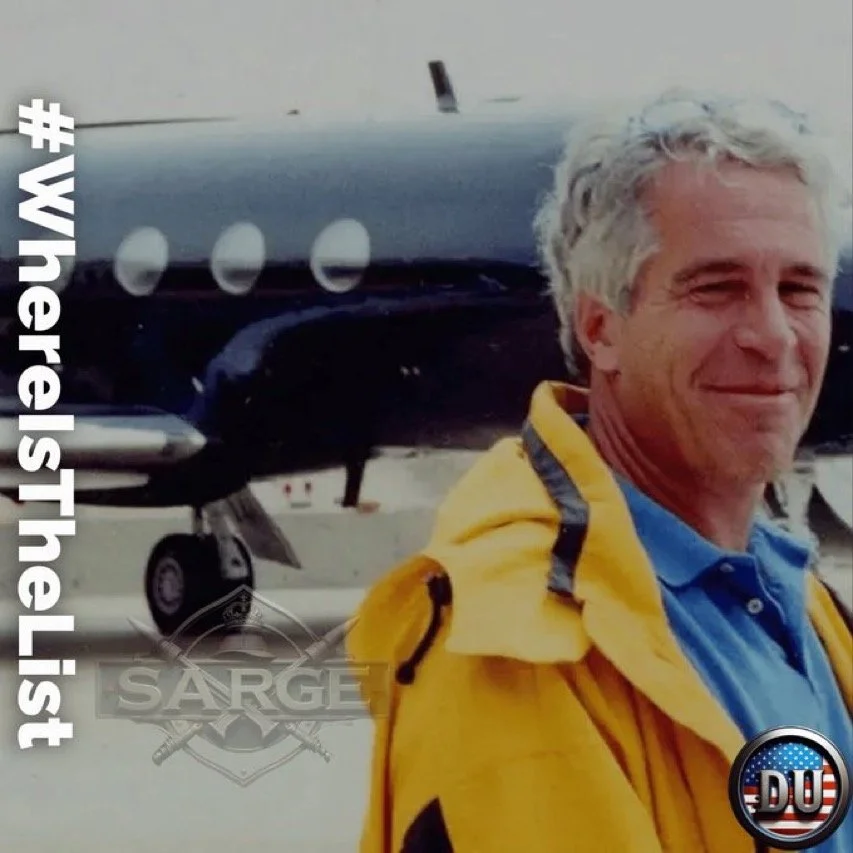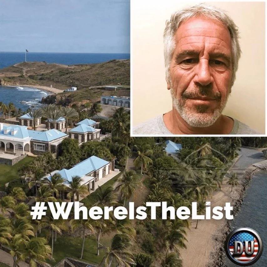 A tropical coastal scene with luxury buildings, palm trees, and a beach, overlaid with a portrait of an older man with gray hair and a beard, and the hashtag #WheresTheList and a round logo with 'DU' in stars and stripes.