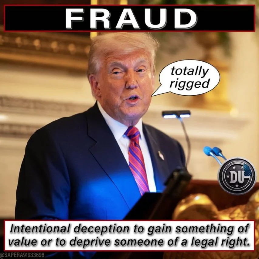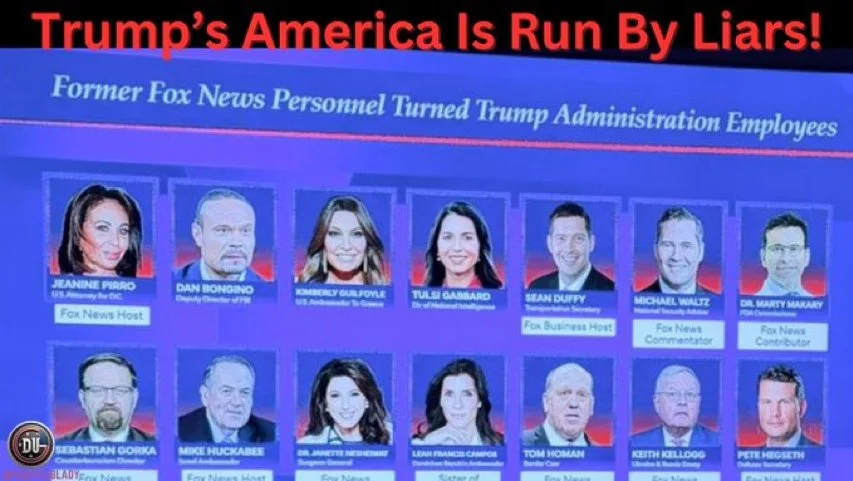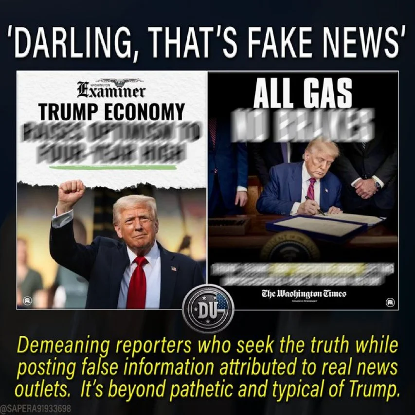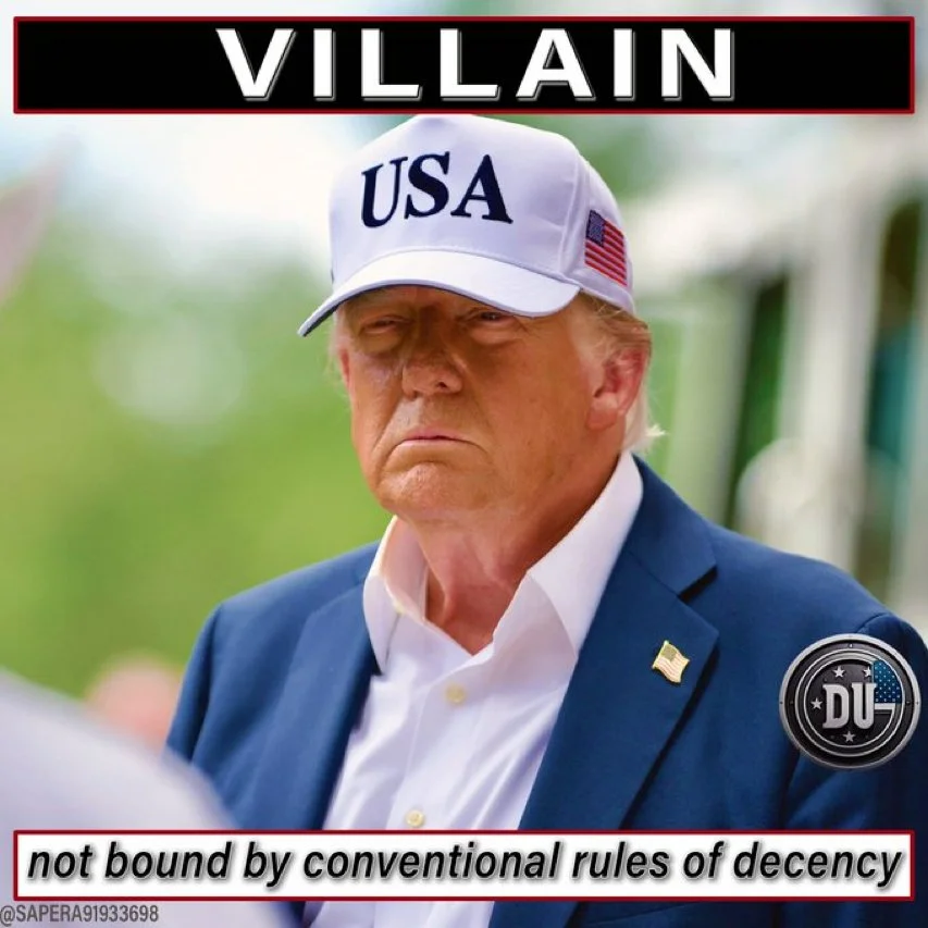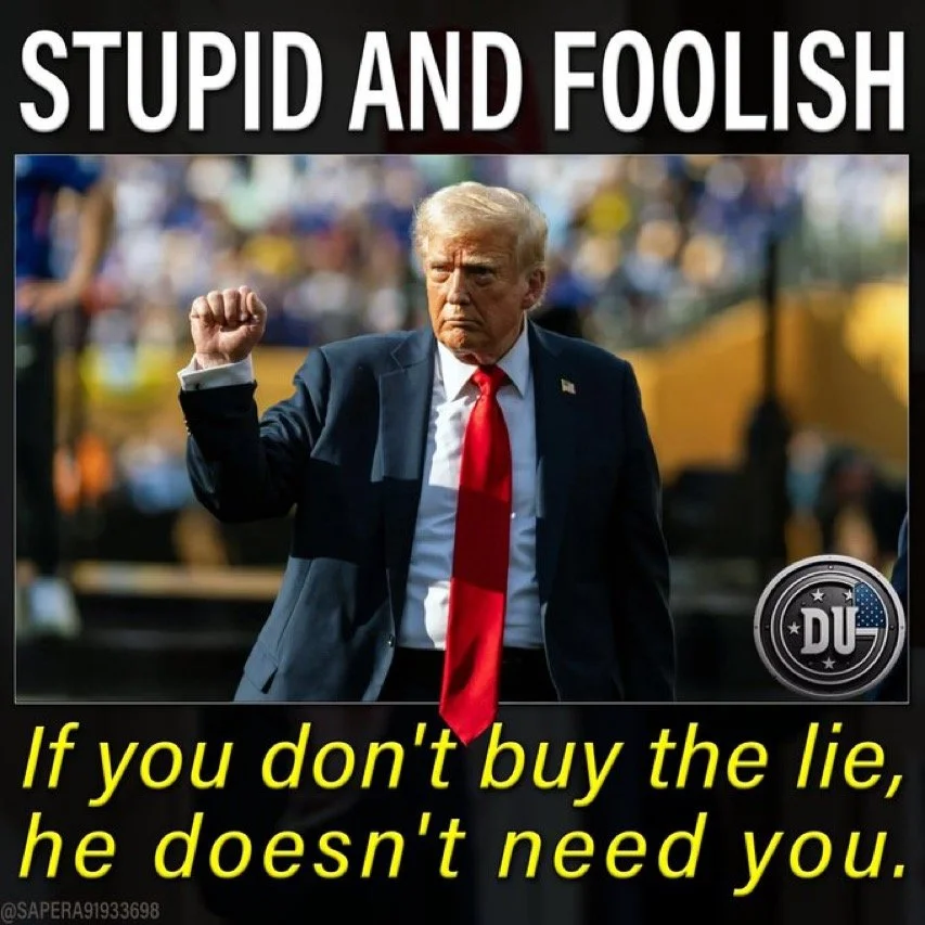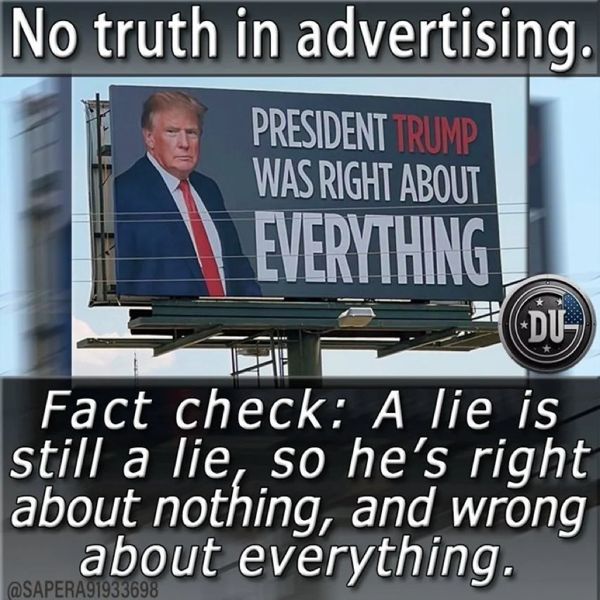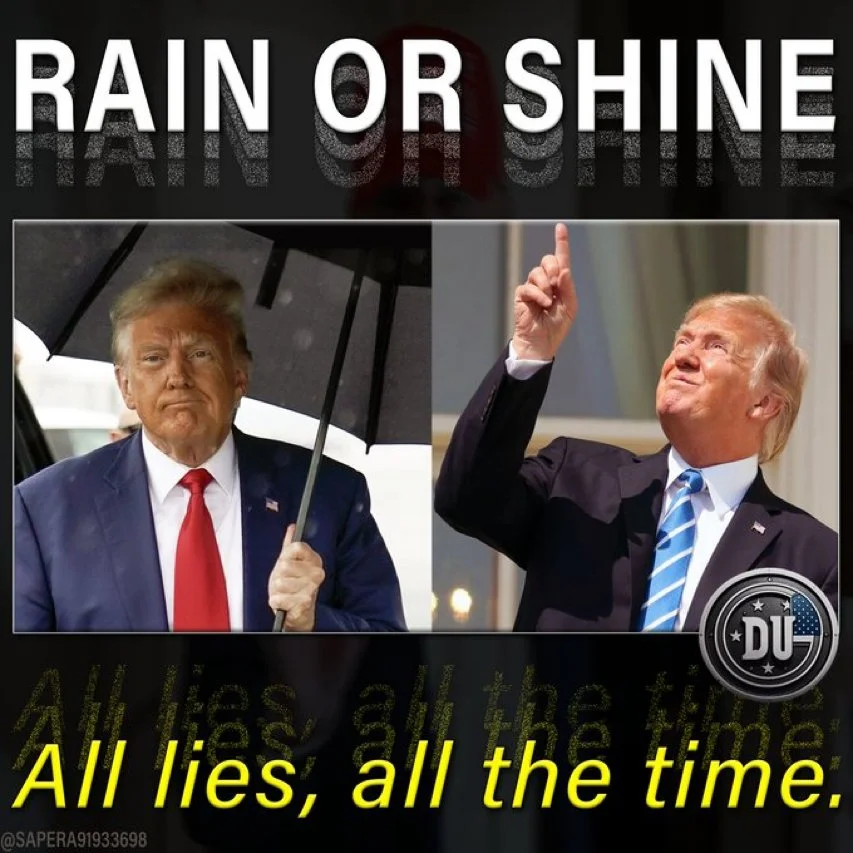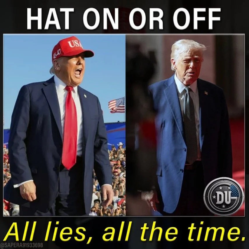 Comparison image of Donald Trump wearing a red hat with 'USA' on it and a red tie, on the left, and Donald Trump not wearing a hat, on the right. The caption says 'HAT ON OR OFF' and 'All lies, all the time.'