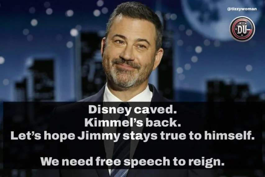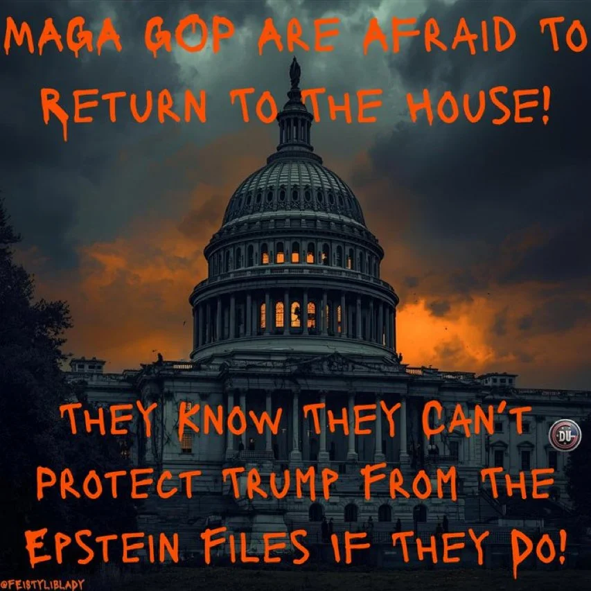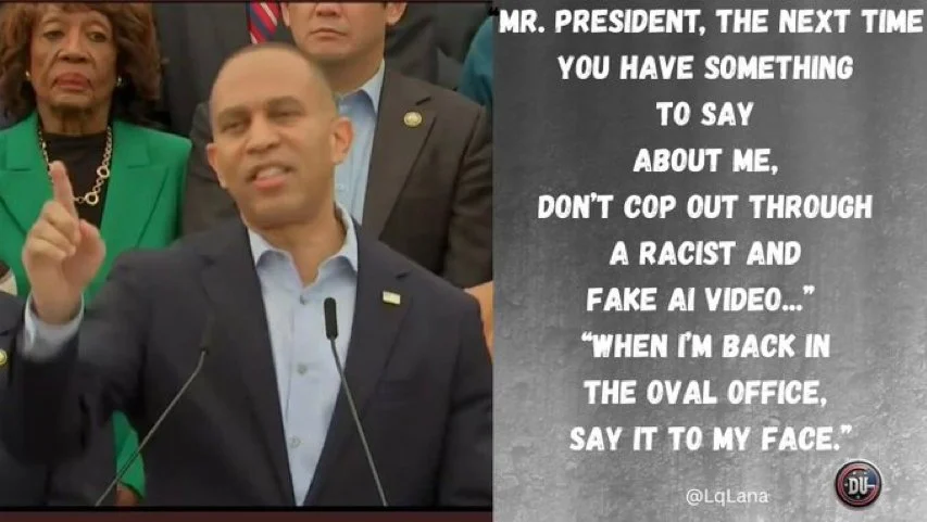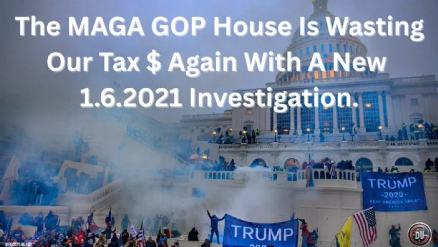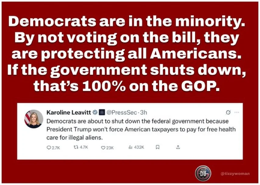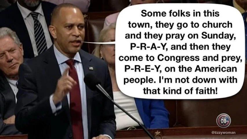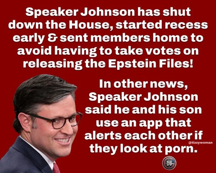 Text overlay on a red background with an image of Speaker Johnson smiling wearing glasses and a suit. The text states that he has shut down the House, sent members home early, and uses an app to alert each other if they look at porn, with additional commentary.
