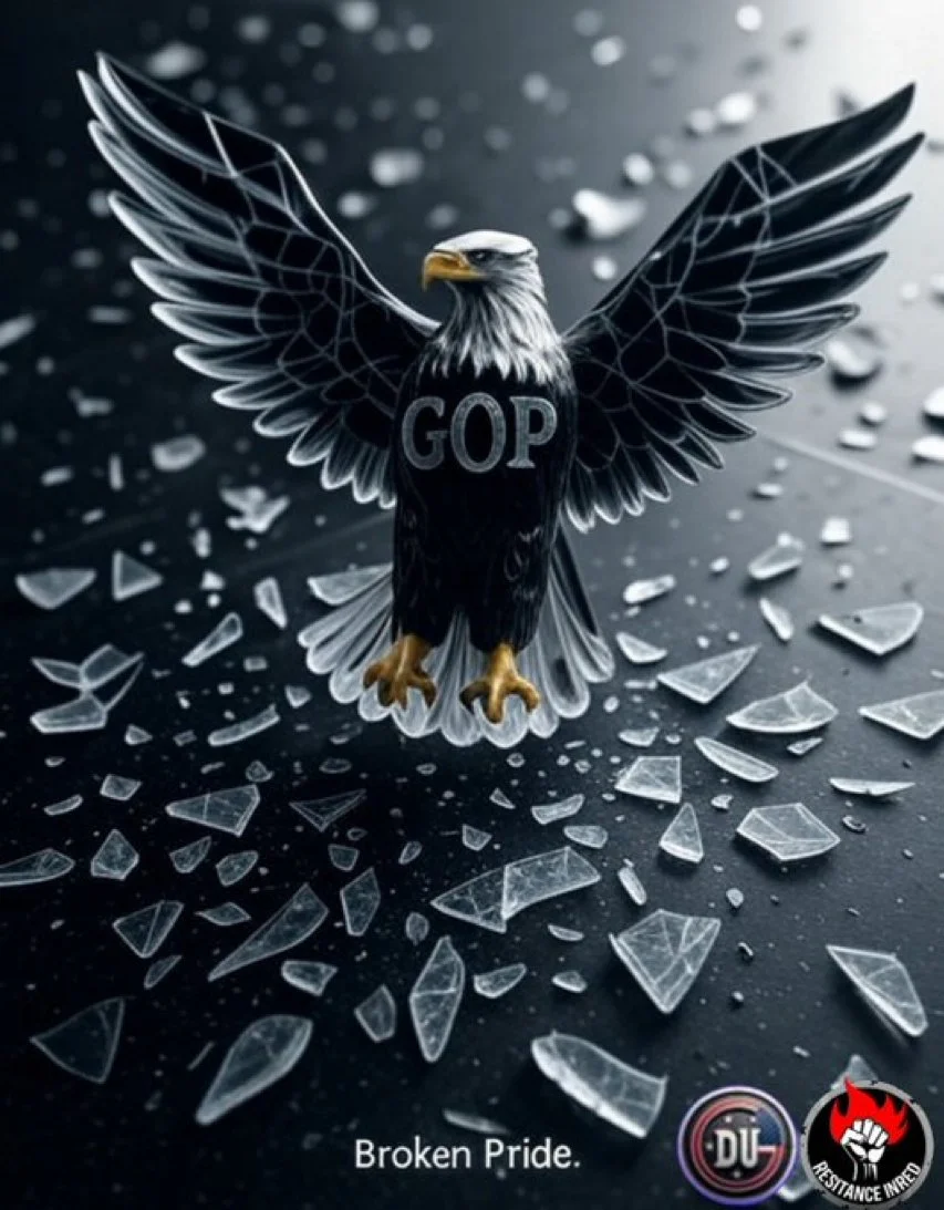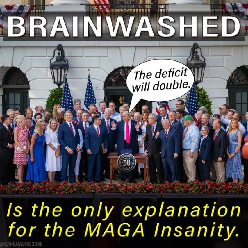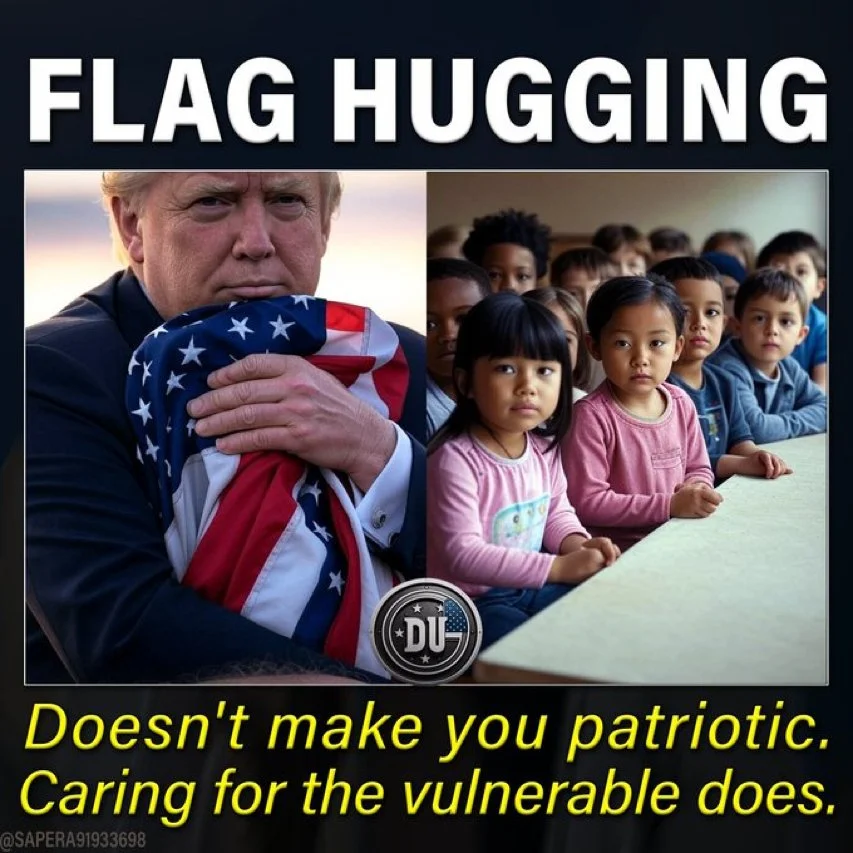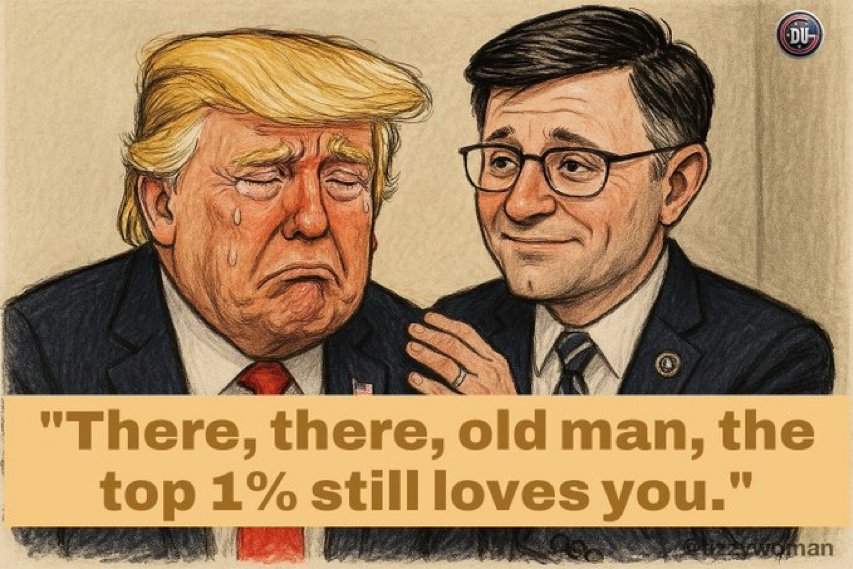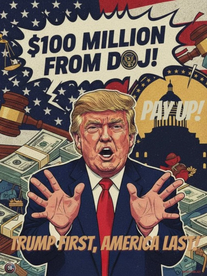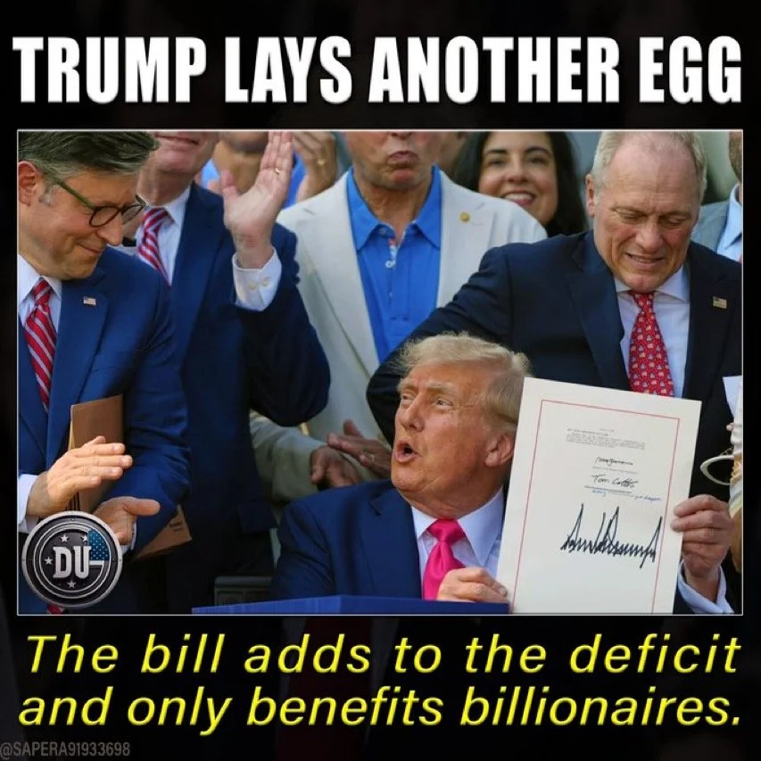 A caricature of Donald Trump with exaggerated facial features, holding a document titled 'Big Beautiful Bill.' The background includes American flags and a warm fire.