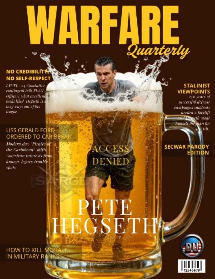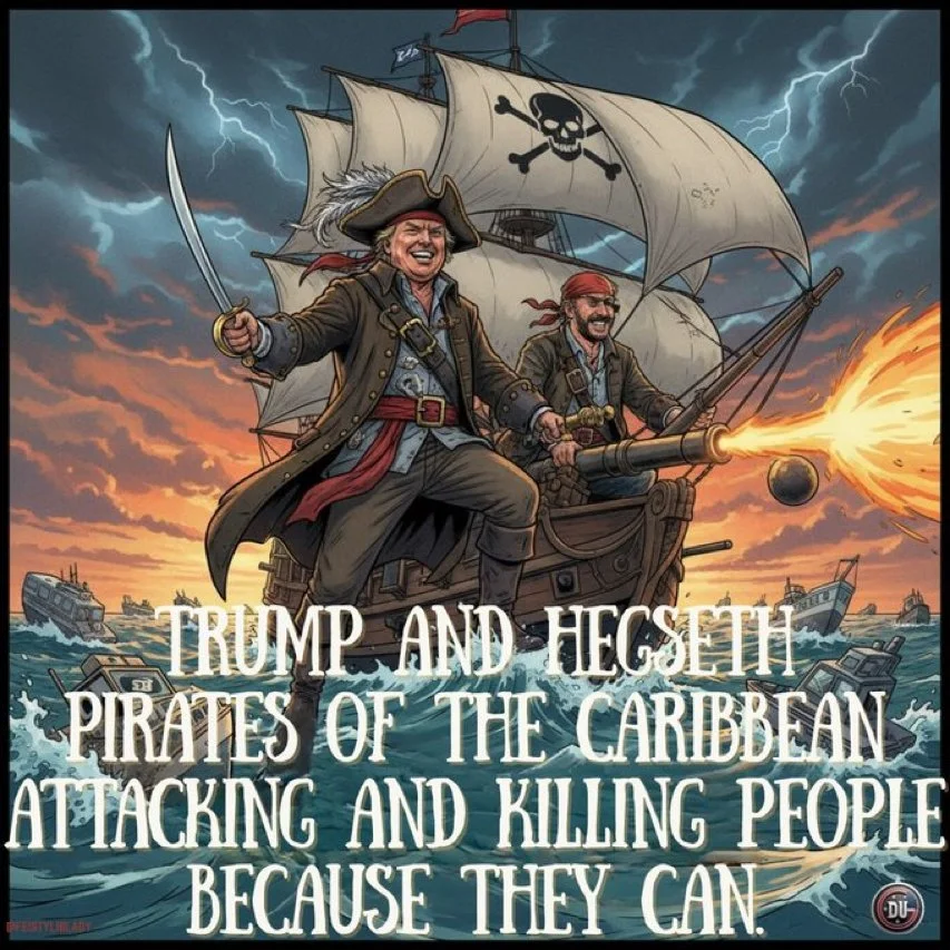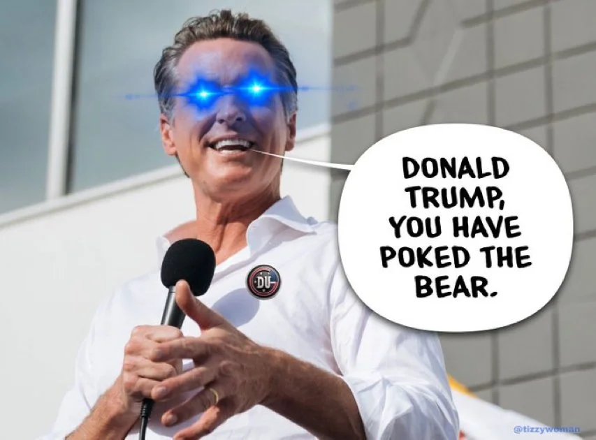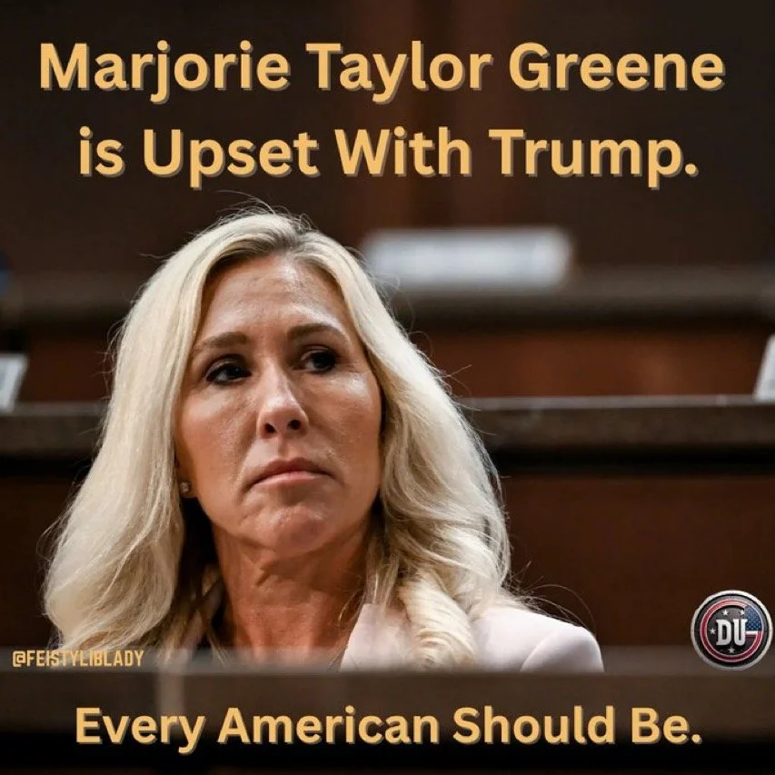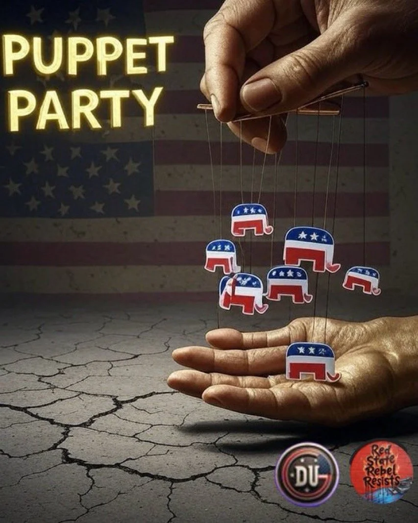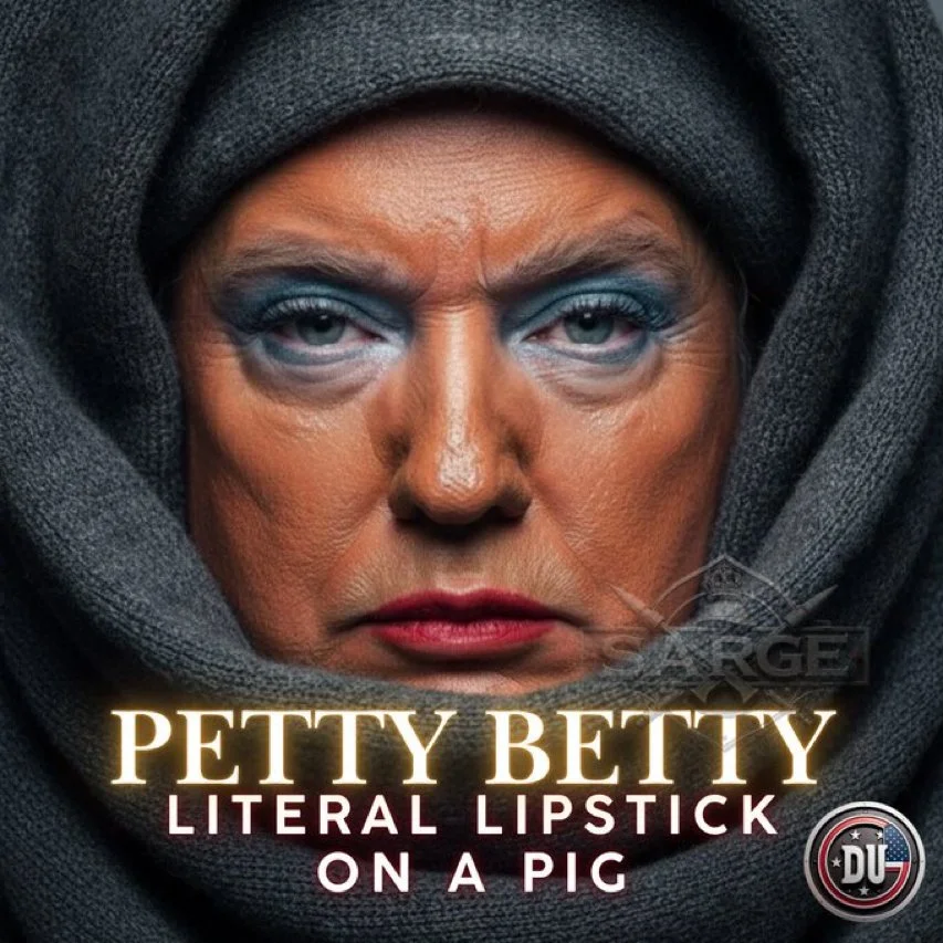 A caricature of Donald Trump with exaggerated facial features, holding a document titled 'Big Beautiful Bill.' The background includes American flags and a warm fire.