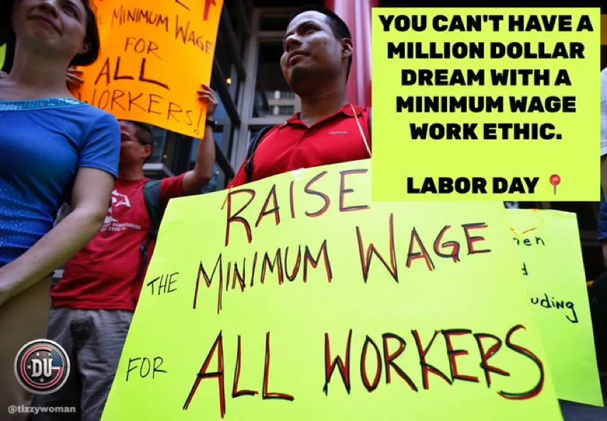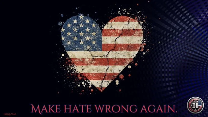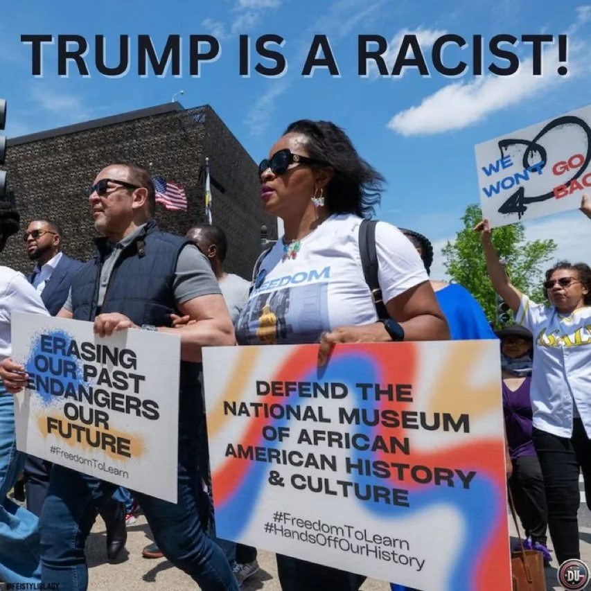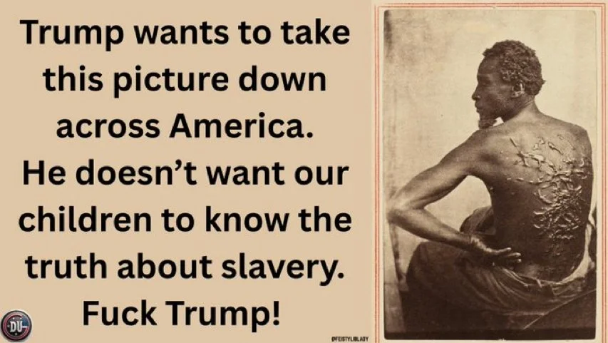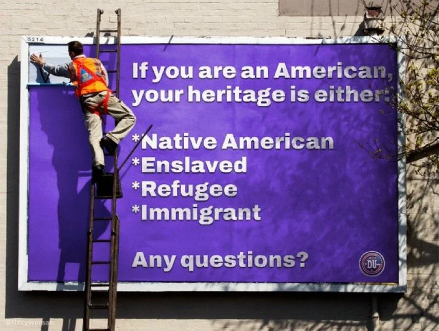 A man in a safety vest on a ladder adjusting a purple billboard that questions American heritage based on ethnicity, asking if it belongs to native Americans, enslaved, refugees, or immigrants.