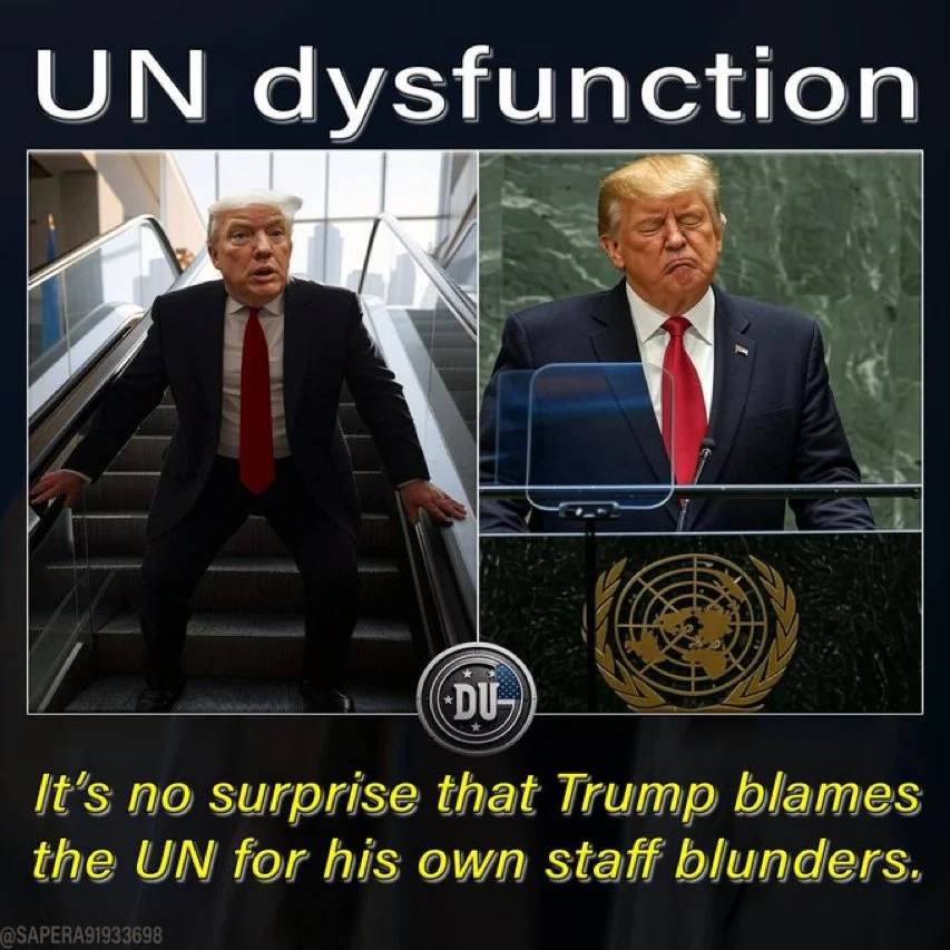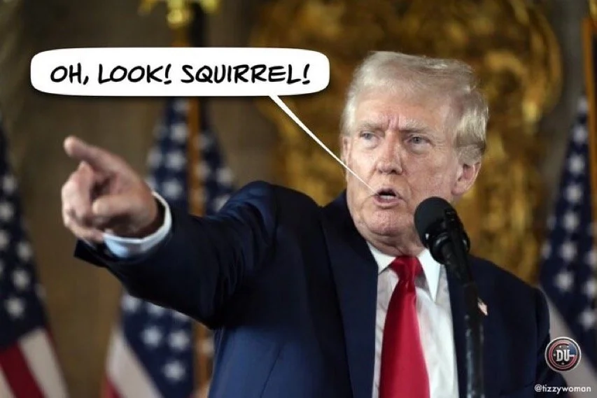 A man resembling Donald Trump speaking at a podium, with a speech bubble saying 'Oh, look! Squirrel!'