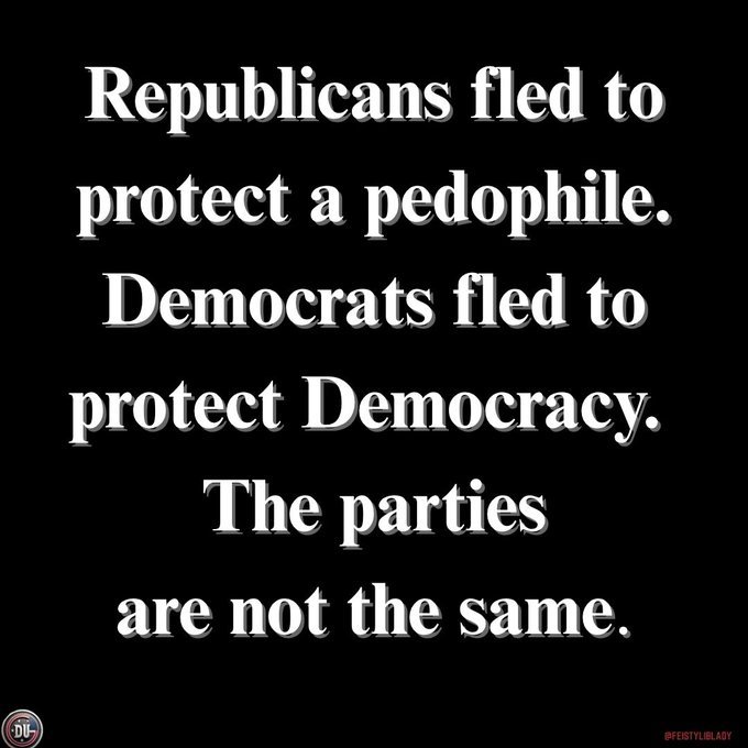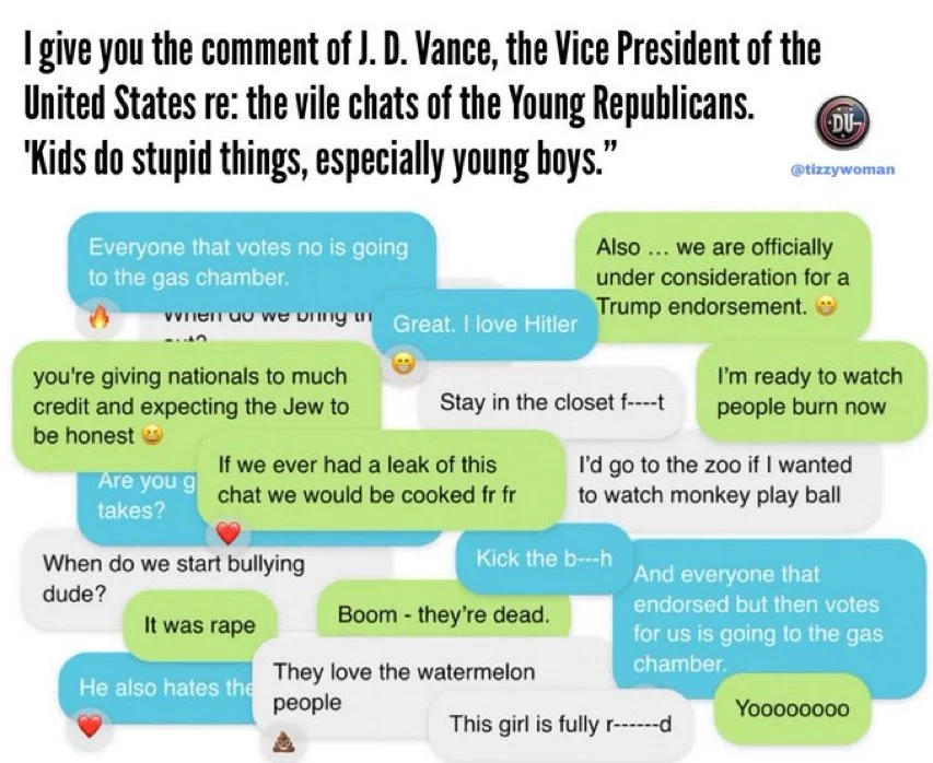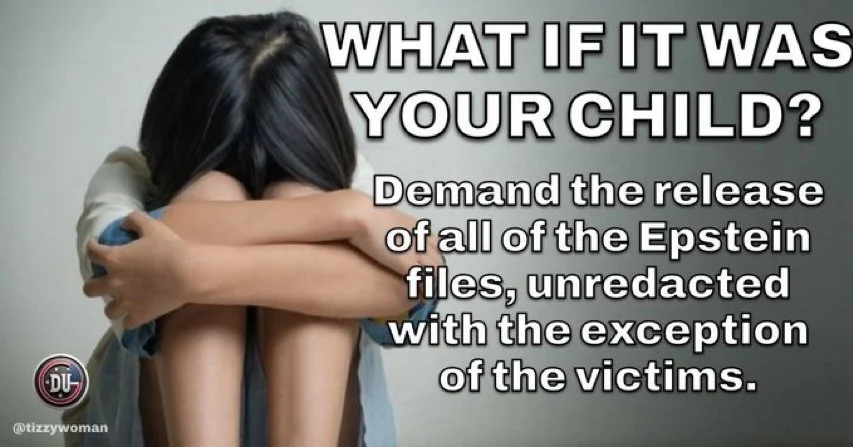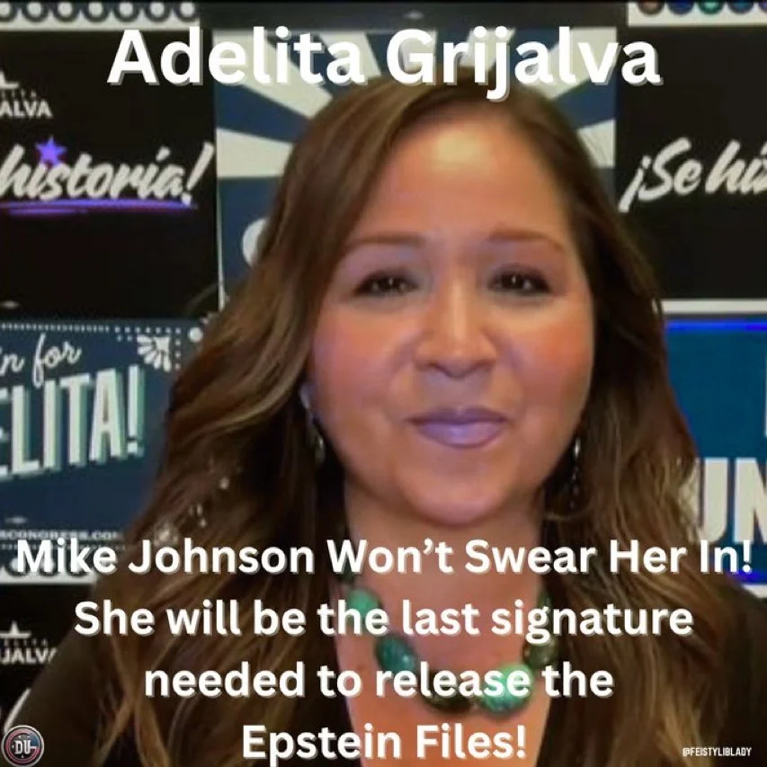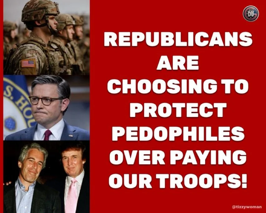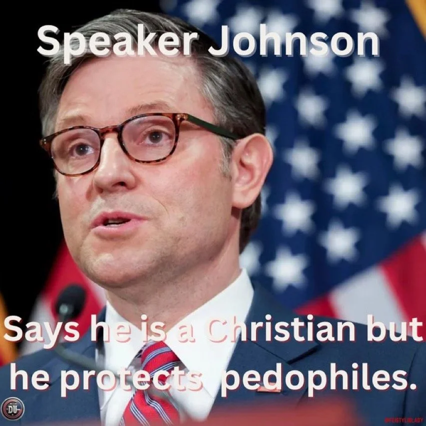 A man wearing glasses and a suit with a red and blue striped tie, speaking at a political event with an American flag in the background. Text overlay says: 'Speaker Johnson Says he is a Christian but he protects pedophiles.'