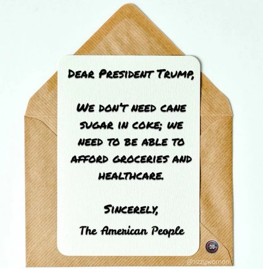 Note in a white card with handwritten font inside a brown envelope, addressing President Trump, about the need to afford groceries and healthcare, signed by The American People.