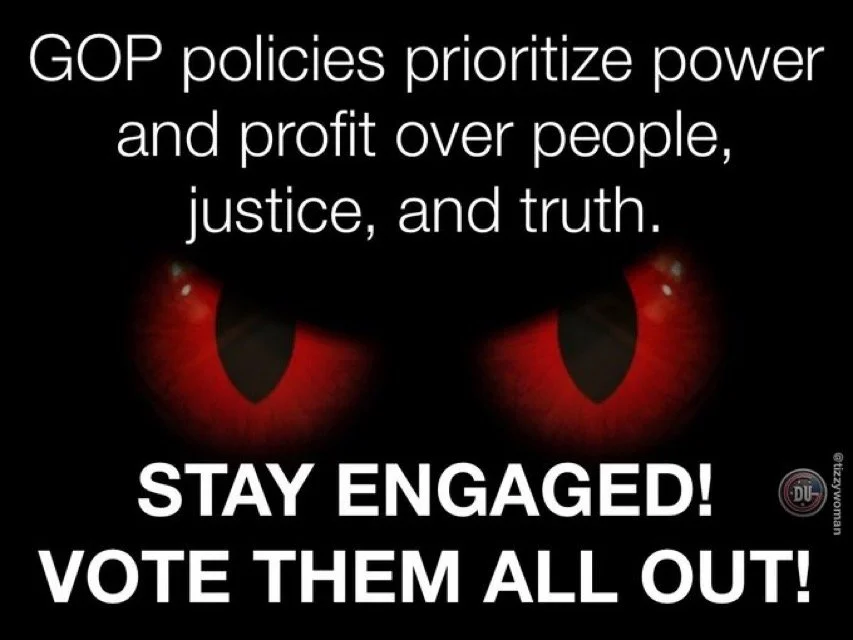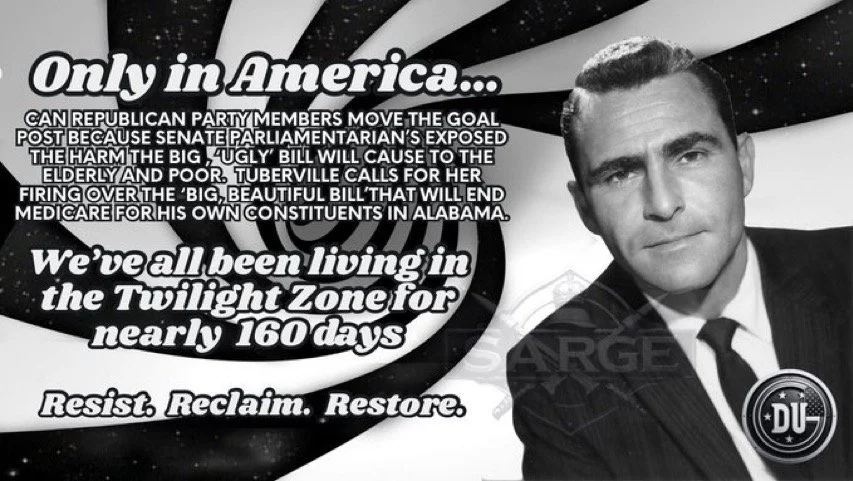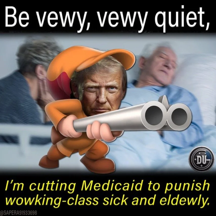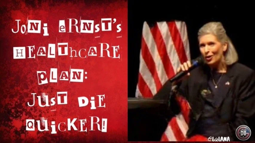 A political protest sign criticizing a bill related to Medicare, with the text in bold red font, an illustration of the U.S. Capitol building in the background, and a QR code.