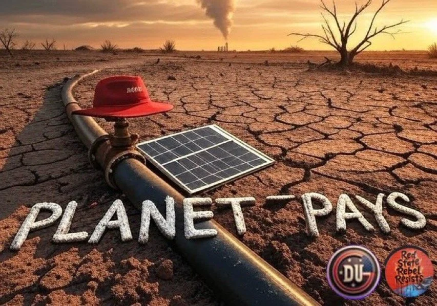 Law enforcement officers, including ICE agents, walking through a wheat field at sunset during an operation, with the caption "Fields of Tension" and logos for DU and Red State Rebel Rebels.