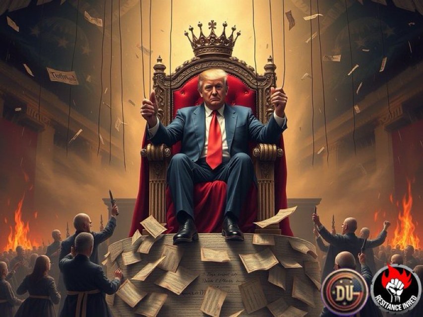 An illustration of a caricatured man with orange hair, wearing a crown and military uniform decorated with medals, standing with fists raised in a triumphant pose on a large, sad-looking paper with a distressed face drawn on it. Around him, a group of children and adults hold protest signs. The background features dark clouds and lightning, with barbed wire in the distance.