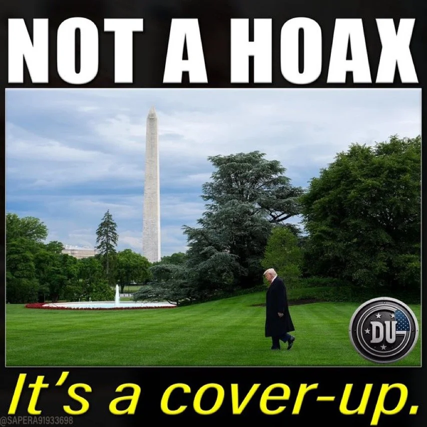 A dark meme with the caption "NOT A HOAX" at the top and "It’s a cover-up." at the bottom. The photo shows Donald Trump walking across a manicured lawn with greenery, a fountain, the Washington Monument, and a cloudy sky in the background.