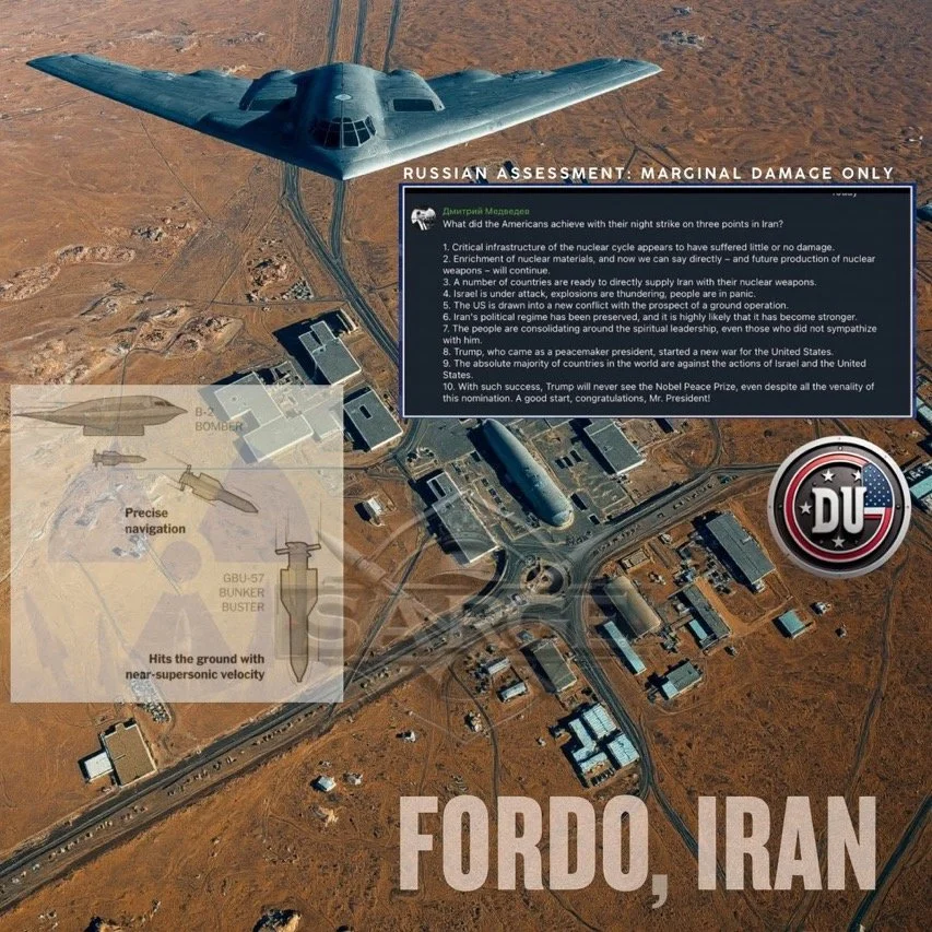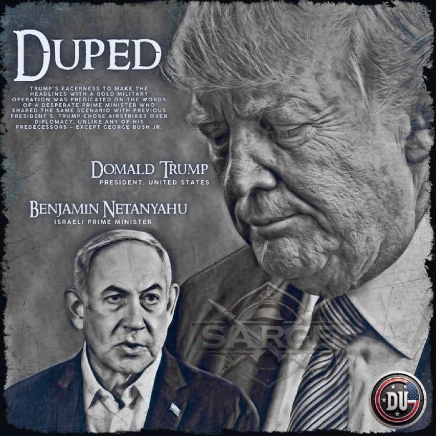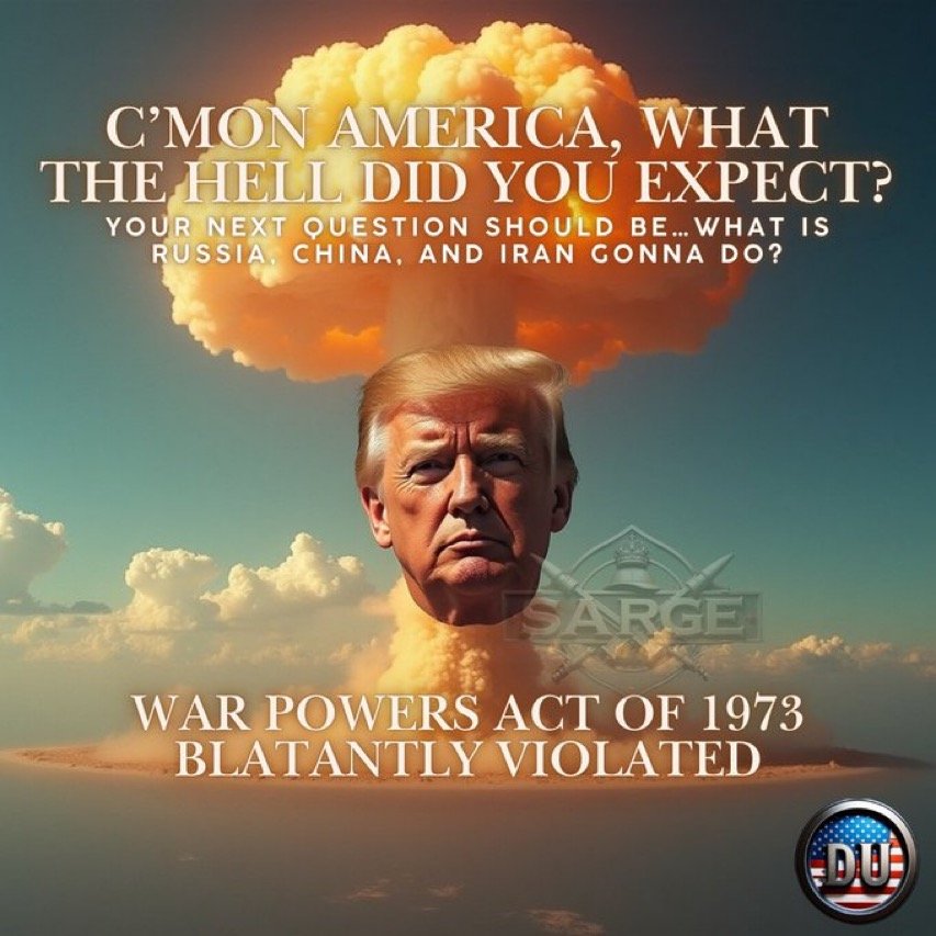 A digitally edited image depicting Donald Trump sitting on a large missile labeled "Sarge" in a fiery background with a city skyline. Text includes "MAGA Don't the Destroyer," "So much for world peace," "MAGA world is in a complete uproar," and "Are you feeling great yet?". An inset tweet criticizes Iran's nuclear deal.