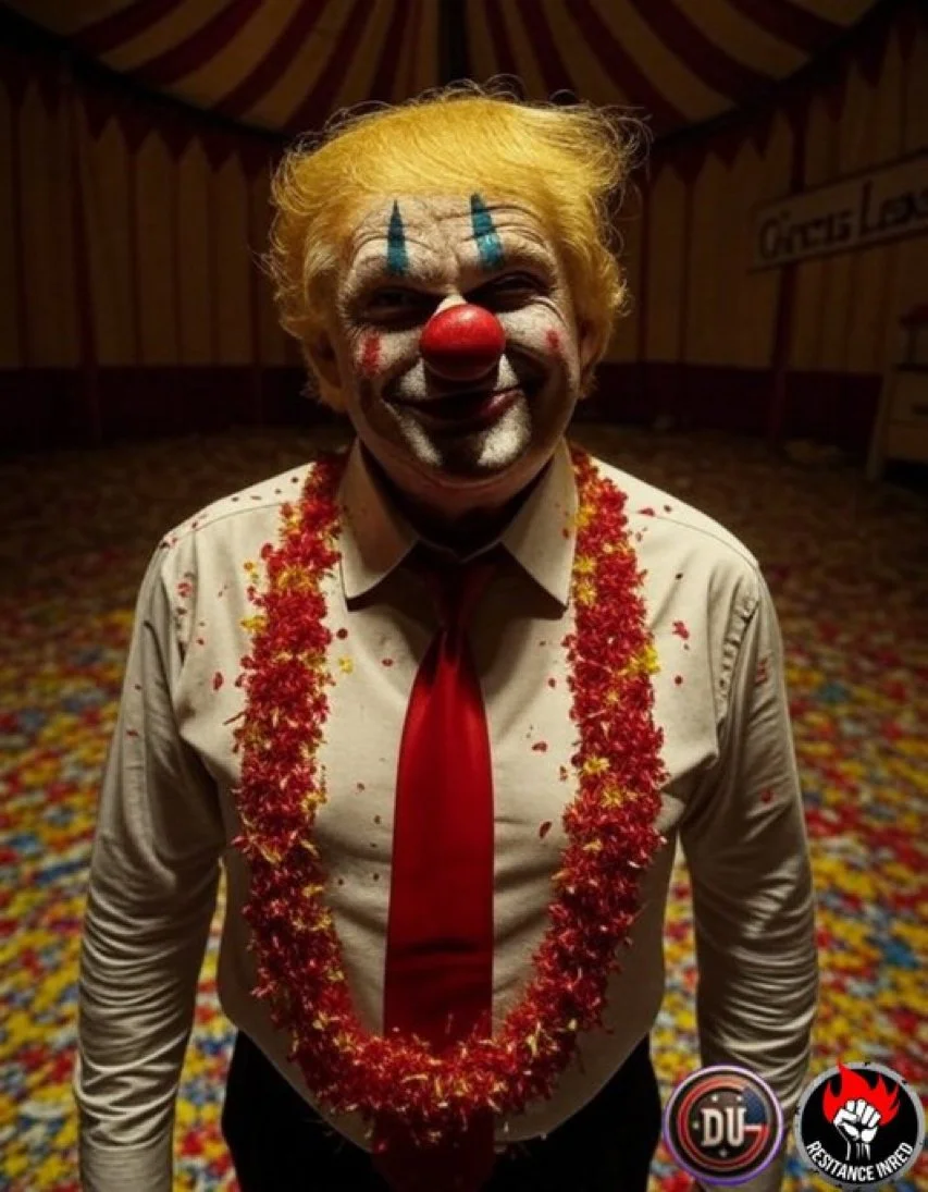 A carnival game wheel with various sections labeled with words such as "DAMN," "OBVIOUS," and others. The wheel is set against a red background with a caricature of Donald Trump in a blue suit and red tie, gesturing with open hands. To the right, there is a carnival ride with a sign saying "STEP RIGHT UP!" and a large striped canopy with yellow and red flags.