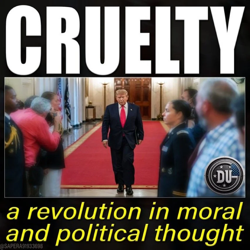 Image of a magazine cover with the word 'CRUELTY' in large white letters at the top. In the center, a photograph shows a man resembling Donald Trump walking down a red carpet with people on either side, some of whom appear to be saluting or paying respects. The caption below reads, 'a revolution in moral and political thought,' in yellow text. There is also a small logo in the bottom right corner.
