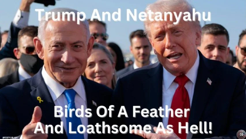 A split-image collage with a man resembling Donald Trump on the top left and a middle-aged man on the bottom left. The right side features an aerial view of a tropical coastal property with multiple white buildings with blue roofs, surrounded by palm trees and overlooking the ocean. The text reads 'BIRDS OF A FEATHER.'