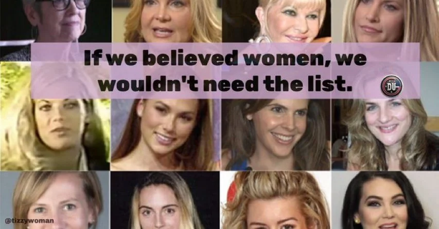 Collage of women with the text, 'If we believed women, we wouldn't need the list,' overlaid in the center.