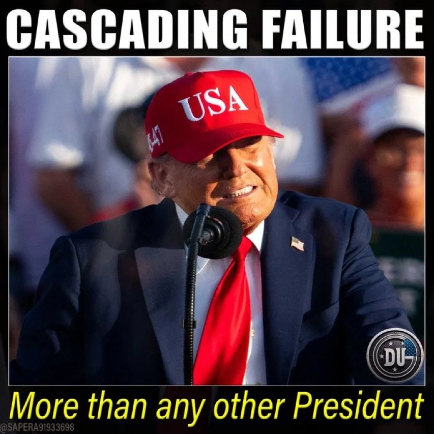 A digitally manipulated photo of Donald Trump wearing a red 'USA' hat, a suit, and a red tie, with a distressed facial expression, standing in front of a microphone. The image has bold text at the top reading 'CASCADING FAILURE' and at the bottom 'More than any other President'.